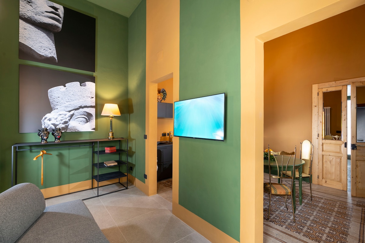 Historijska kuća s kraja 19. vijeka, s originalnim cementom iz tog vremena, s pogledom na grad i glavnu Via Garibaldi s koje se možete diviti katedrali Sant 'Agata i historijskoj Porta Garibaldi (Fortino). Uživajte u elegantnom odmoru u ovom smještaju u centru grada, s pogledom na Duomo i Casa Museo Giovannija Verge, cijenit ćete lokaciju i blizinu fantastičnog antičkog pozorišta i dvorca Ursino, kao i sve atrakcije grada Catanije!