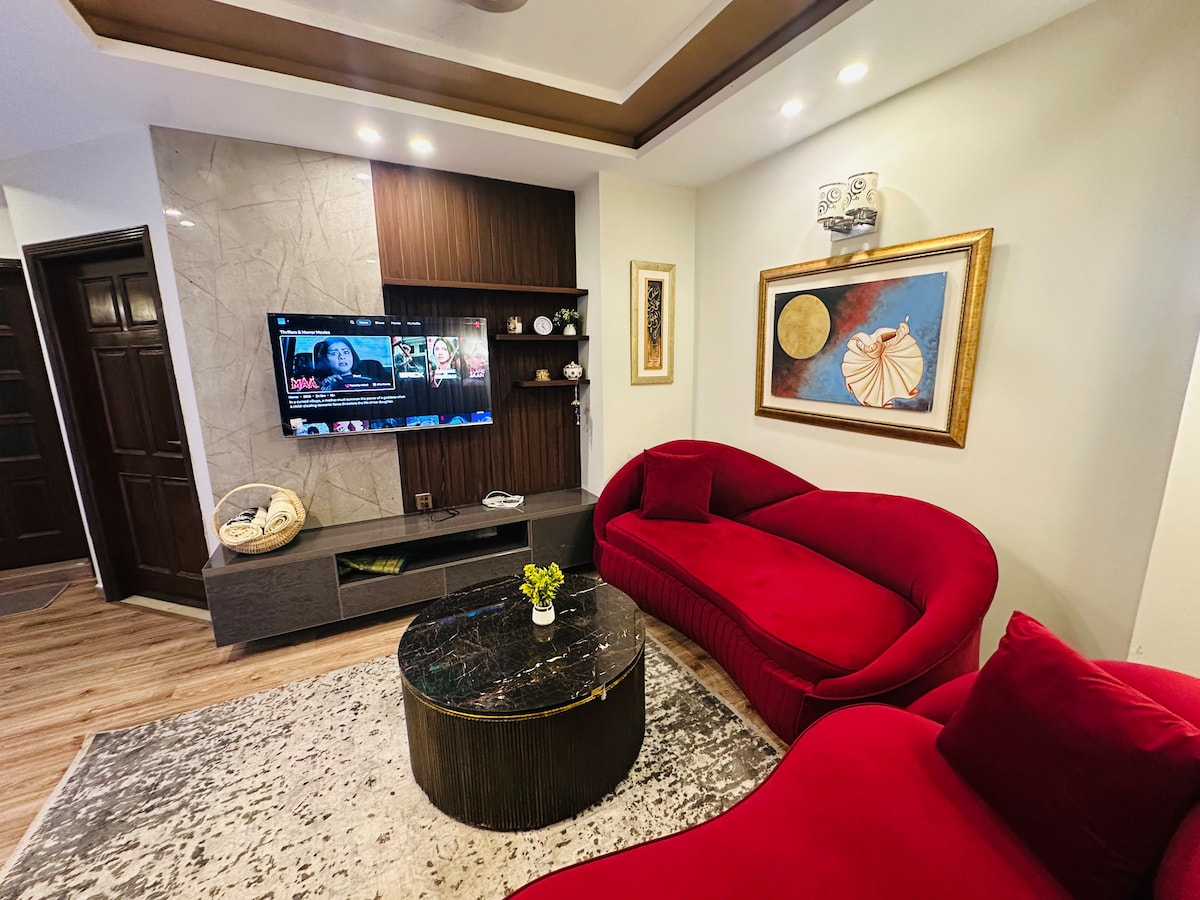 Dobrodošli u @blueoakresidences Prostran stan od 1500 kvadratnih stopa u F-11/1 Islamabadu s 2 spavaće sobe s privatnim balkonom, toaletom, UPS rezervnim napajanjem, brzim Wi-Fi mrežom, samostalnom prijavom i 58-inčnim pametnim TV-om. Kuhinja, topla voda, besplatan parking, lift koji radi 0–24 uključen. Za grupe veće od 4 osobe, na raspolaganju su 2 dodatna madraca na podu za najviše 6 gostiju. Kolica su dostupna na zahtjev za 3 ili više noćenja (5000 PKR). Koraci od Loafology, Nando's, Asian Wok, KFC, Al-Fatah. Park prikladan za porodice je odmah ispred.