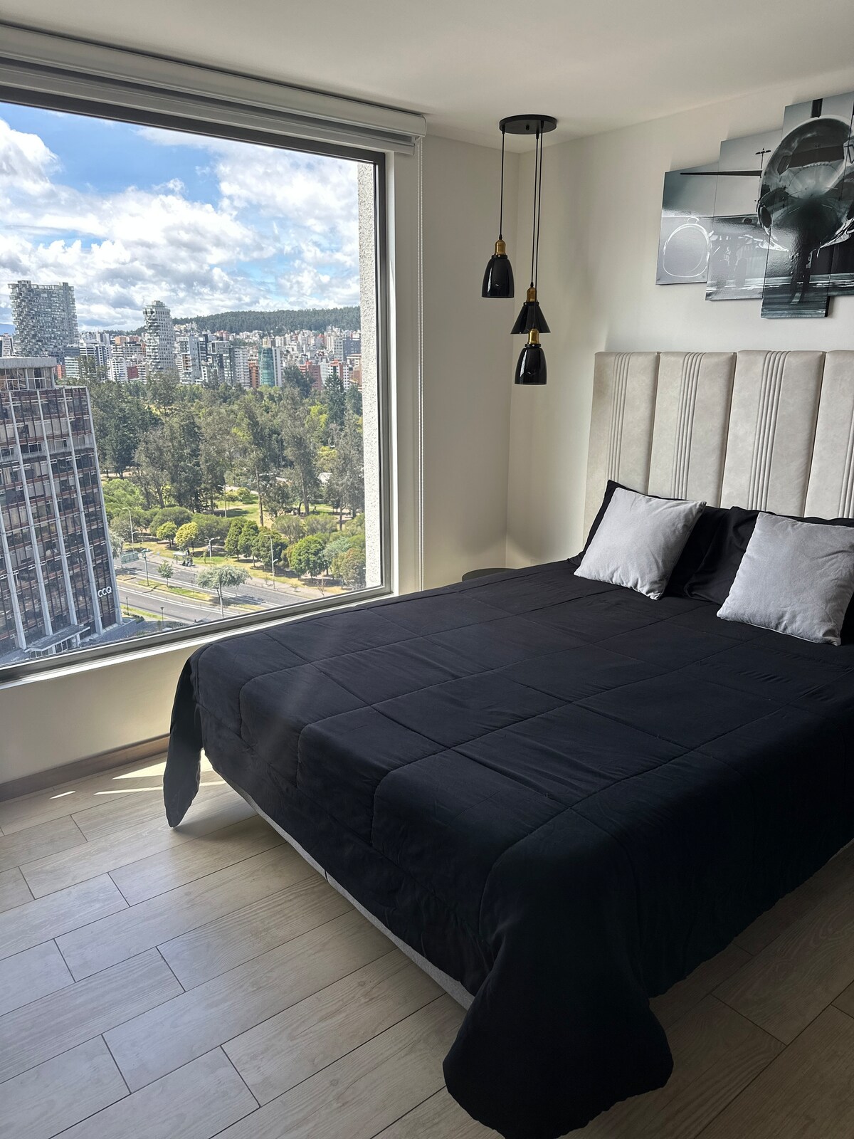 Modern, brand-new studio on the 14th floor with direct views of La Carolina Park. Studio amenities: • High-speed fiber optic WiFi • 55” QLED Smart TV • Ultra-comfortable bed • Fully equipped kitchen • Modern bathroom • Smart lock • 24/7 security Social areas (17th floor): • Gym • Coworking area with WiFi • Game room • BBQ area • Jacuzzi (available only for stays longer than two nights) Prime location, just 15 minutes from the Quito Metro, malls, and restaurants.