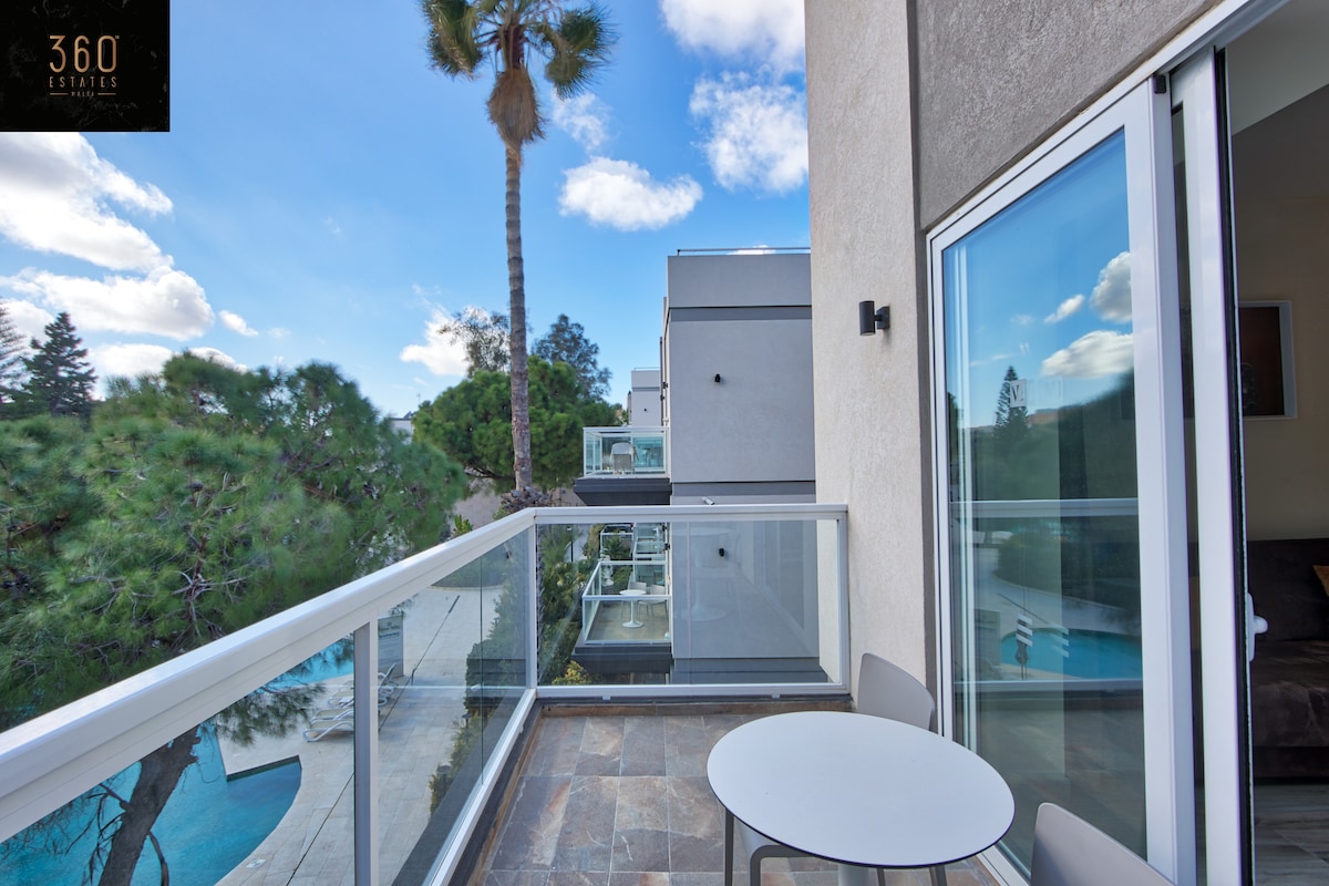 Ovaj luksuzni jednosobni stan nudi miran pogled na sjeverozapad s predivnim zalascima sunca prema Gozu. Prozori od poda do plafona otvaraju se na privatni balkon s pogledom na more. Uživajte u elegantnom dnevnom boravku s kaučem na razvlačenje, potpuno opremljenoj kuhinji, mirnoj spavaćoj sobi i modernom kupatilu. Gosti imaju besplatan pristup bazenu i spa centru u tornju Mercury i uživaju u sadržajima kao što su restorani, teretana i tržni centar za udoban i opuštajući boravak u St. Julian'su.