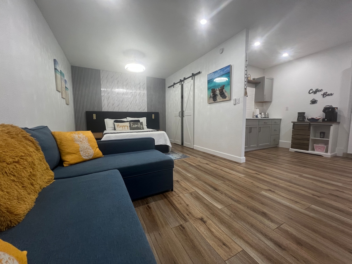 Odsjednite u našem renoviranom prekrasnom studio apartmanu u stilu plaže s bračnim krevetom i kaučem na razvlačenje. Tu je mini frižider, električna ploča za kuhanje s dva plamenika, mikrovalna pećnica, toster, lonac za čaj s dodatnim vrećama za čaj, lonac za kafu s dodatnom kafom i keurig s dodatnim Starbucks k Cups. Besplatan Wi-Fi i TV od 50 inča okrenut prema krevetu. 2 minute od zračne luke, 10 minuta udaljen od IMG akademije , 30 minuta od ostrva Anna Maria i ključa za siestu.