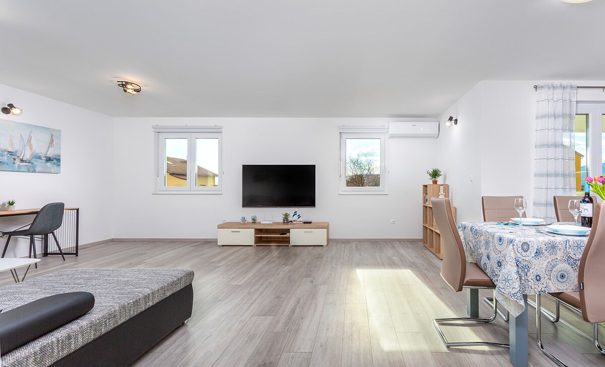 Escape to our stylish seaside apartment in Kantrida with spectacular Adriatic views from a spacious balcony. This brand-new, light-filled space comfortably fits couples or small families. Features include a dedicated workspace, fast Wi-Fi, a fully equipped kitchen, and free secure garage parking. Enjoy easy access to the beach, Rijeka, and Opatija. Perfect for a modern coastal getaway!