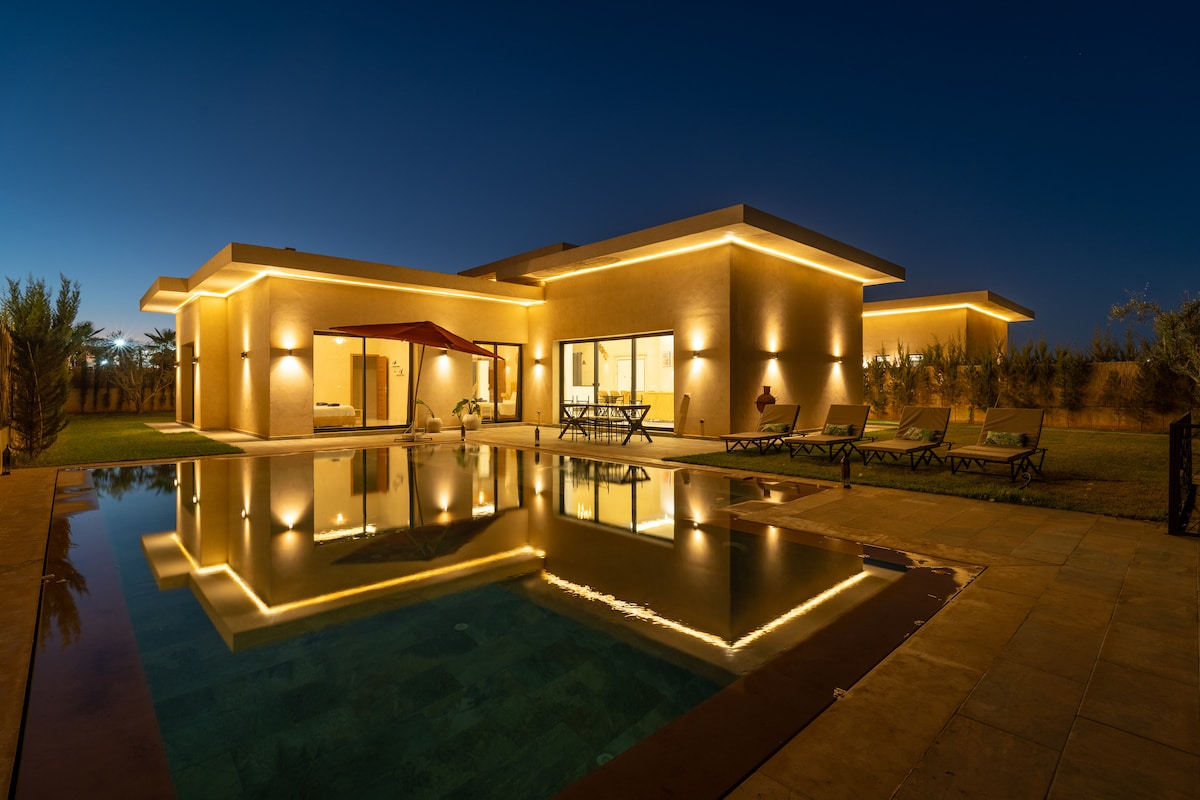Villa située à 30 minutes de Gueliz dans un charmant domaine sécurisé 24/7 avec terrain de tennis commun et piscine privée. La villa se compose de 3 tres grandes suites avec chacune leur cheminée, leur télé (Netflix gratuit), 3 salles de bain, d'une petite piscine intérieure chauffée, d'une piscine extérieure privative et d'un jardin privatif sans vis à vis, d'un salon avec cheminée. Table à manger convertible en billard et en table de ping-pong. Idéal pour se détendre au calme.
