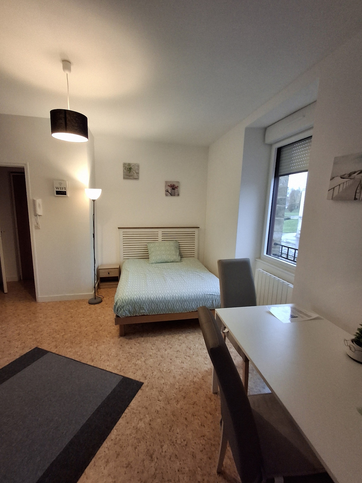 Studio de 23 m2 dans le centre ville de Martigné-Ferchaud, ville située sur l'axe 2 X 2 voies Rennes/Angers (40 min de Rennes), idéal pour 1 personne en déplacement professionnel, stage, formation ou privé. 3 nuits minimum 1 lit double (140 x 190), coin cuisine équipée, salle de bain avec sèche serviettes et WC séparé, télévision, penderie, Linge de lit et serviettes fournis. Connexion wifi