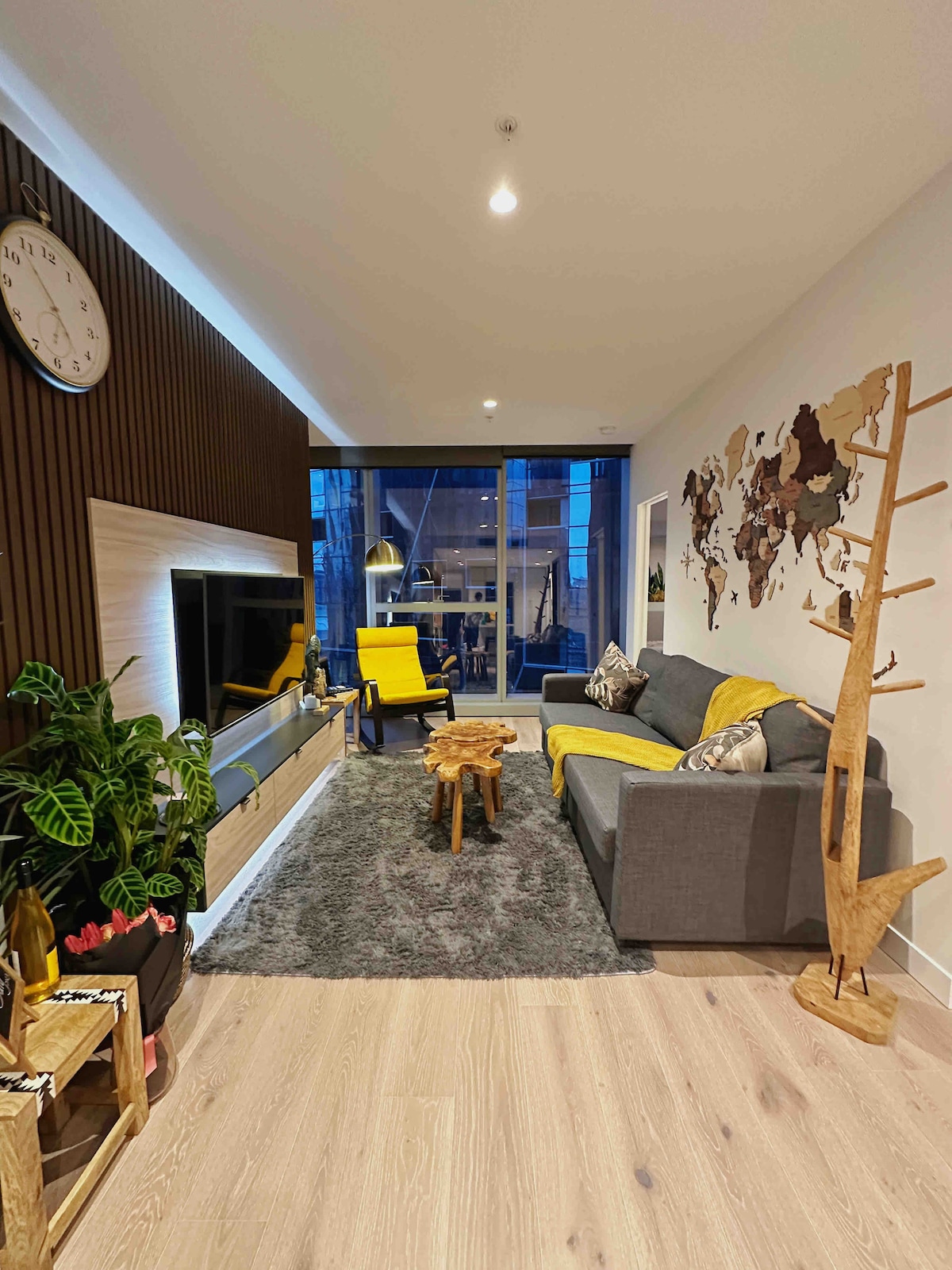 Miran prostor u kojem ćete se osjećati kao kod kuće dok ste u Melburnu, vaš dvosobni stan s 2 kupatila (64sqm Interni + 6sqm balkon). Dizajniran ima utočište na umu jednostavno moderno i minimalističko. Uživajte u nevjerovatnom pogledu na horizont grada. Ovo je prostor prikladan za porodice. Nalazi se pored stanice Southern Cross i autobuskog terminala Sky. Smješten u zoni besplatnog tramvaja, sve što Melbourne može ponuditi je na dohvat ruke - u blizini jeftinih restorana, otmjenih restorana i modernih kafića.