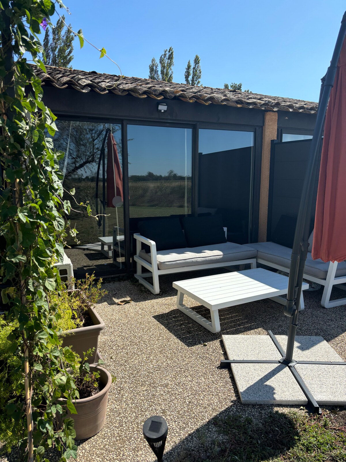 The proximity of the city combined with the silence and beauty of the landscape.... Relaxation and wellbeing are guaranteed at this charming place surrounded by an exuberant garden with various essences, plants and trees. The apartment is located in a full renovated (2022) 16th century authentic Camargue farmhouse with its own large covered terrace beautifully surrounded by glycine.