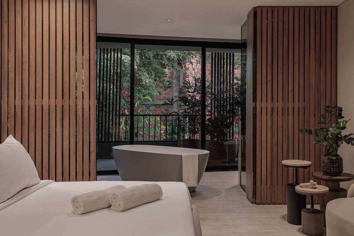 Uživajte u luksuzu u Medellinu smještenom u živahnom srcu četvrti Provenza. Uživajte u raskošnom namještaju, privatnom jacuzziju, pogledu na grad i vrhunskim sadržajima. Svaka pažljivo dizajnirana rezidencija s 2 kreveta/2,5ba pruža vrhunsku udobnost i sofisticiranost. Uronite u Provenzine kafiće, butike i poznati noćni život, udaljen samo nekoliko koraka. Doživite najbolje od Medellina u našoj zgradi, gdje je svaki detalj osmišljen za boravak bez premca.