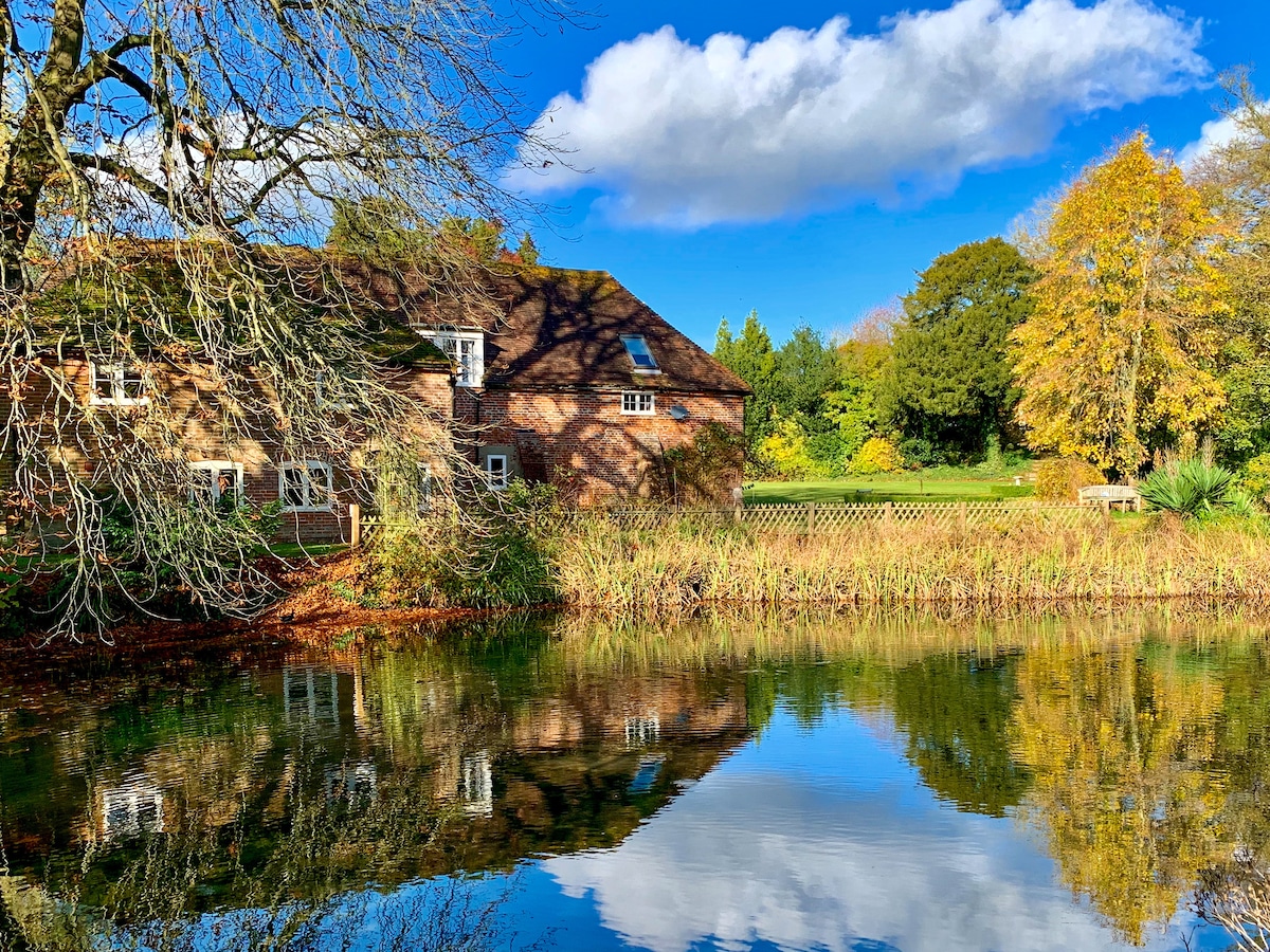 Nunfield Barn is a beautifully converted barn and one portion of the house is internally separated for our Airbnb guests, with its own entrance, downstairs toilet, kitchen/dining area and living room with doors leading to a private patio. Upstairs there are two double bedrooms and a bathroom with bath and shower. There is an above ground pool for use in summer, a front garden shared with us when we are here. There are fields &orchards across the road and we are 15 minute drive to Leeds Castle