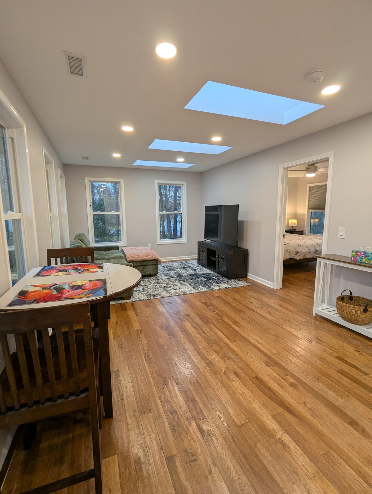 Odsjednite u našem privatnom apartmanu na donjem spratu našeg doma! Imamo odličnu lokaciju samo 9 minuta vožnje do UNC-a, a jednostavan pristup I-40 vas lako vodi do RDU-a i aerodroma. Pružamo brzi internet s ethernet priključkom i mrežastim Wi-Fi mrežom i posebnom radnom stanicom. Veliki TV ravnog ekrana uključuje najmanje 3 usluge streaminga i našu ličnu digitalnu biblioteku filmova putem aplikacije Apple TV. Potpuno opremljena stanica Keurig s kafom, čajem i jutarnjim osnovnim potrepštinama!