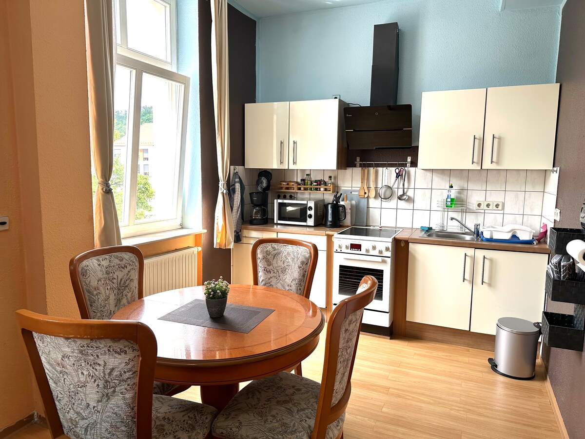 Dobro došli u naš udoban stan. Ovo odlično mjesto se nalazi u samom centru Meiningena s odličnim pogledom na gradsku crkvu i tržni trg. Udaljen je samo nekoliko koraka od mnogih restorana, kafića, prodavnica i atrakcija. Bilo da želite istražiti kulturu ili šarmantne kutke, sve je na pješačkoj udaljenosti. Potrebno vam je samo 9 minuta do glavne željezničke stanice i 8 minuta do pozorišta. Radujemo se što ćemo vas ugostiti!