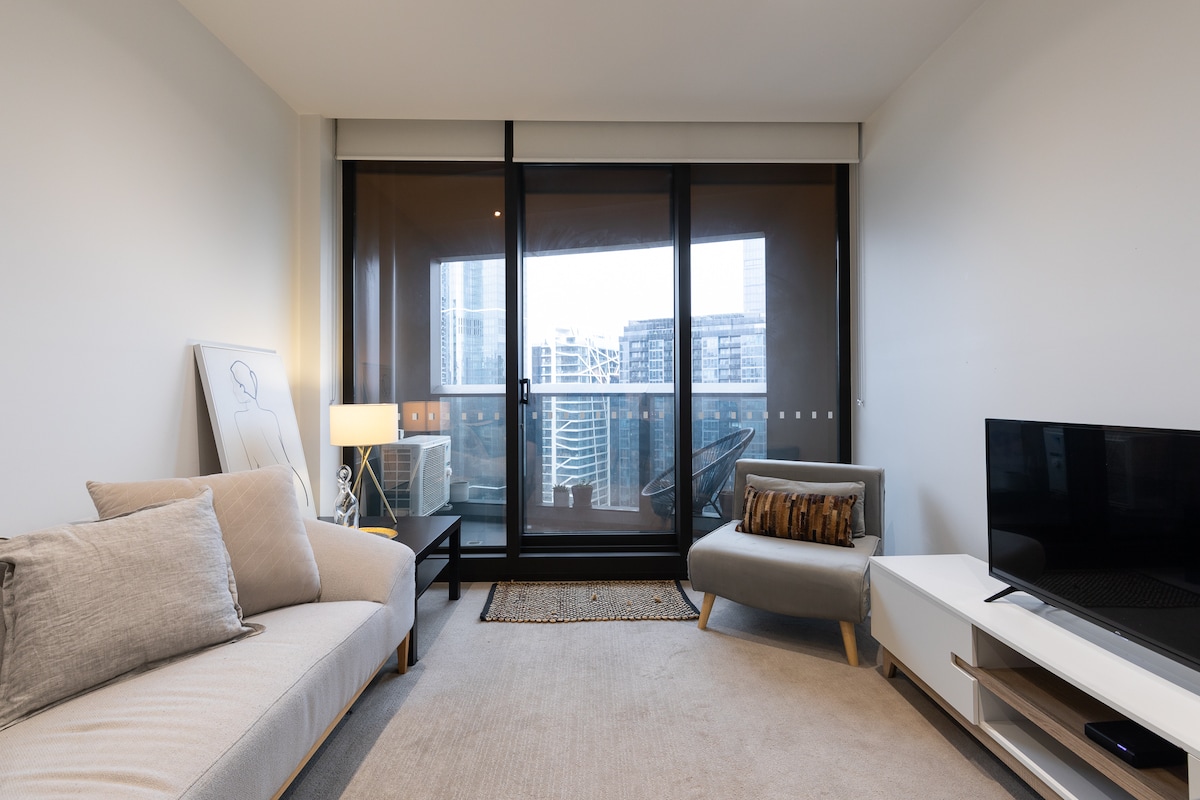 Miran prostor u kojem ćete se osjećati kao kod kuće dok ste u Melburnu, vaš dvosobni stan s 2 kupatila (64sqm Interni + 6sqm balkon). Dizajniran ima utočište na umu jednostavno moderno i minimalističko. Uživajte u nevjerovatnom pogledu na horizont grada. Ovo je prostor prikladan za porodice. Nalazi se pored stanice Southern Cross i autobuskog terminala Sky. Smješten u zoni besplatnog tramvaja, sve što Melbourne može ponuditi je na dohvat ruke - u blizini jeftinih restorana, otmjenih restorana i modernih kafića.