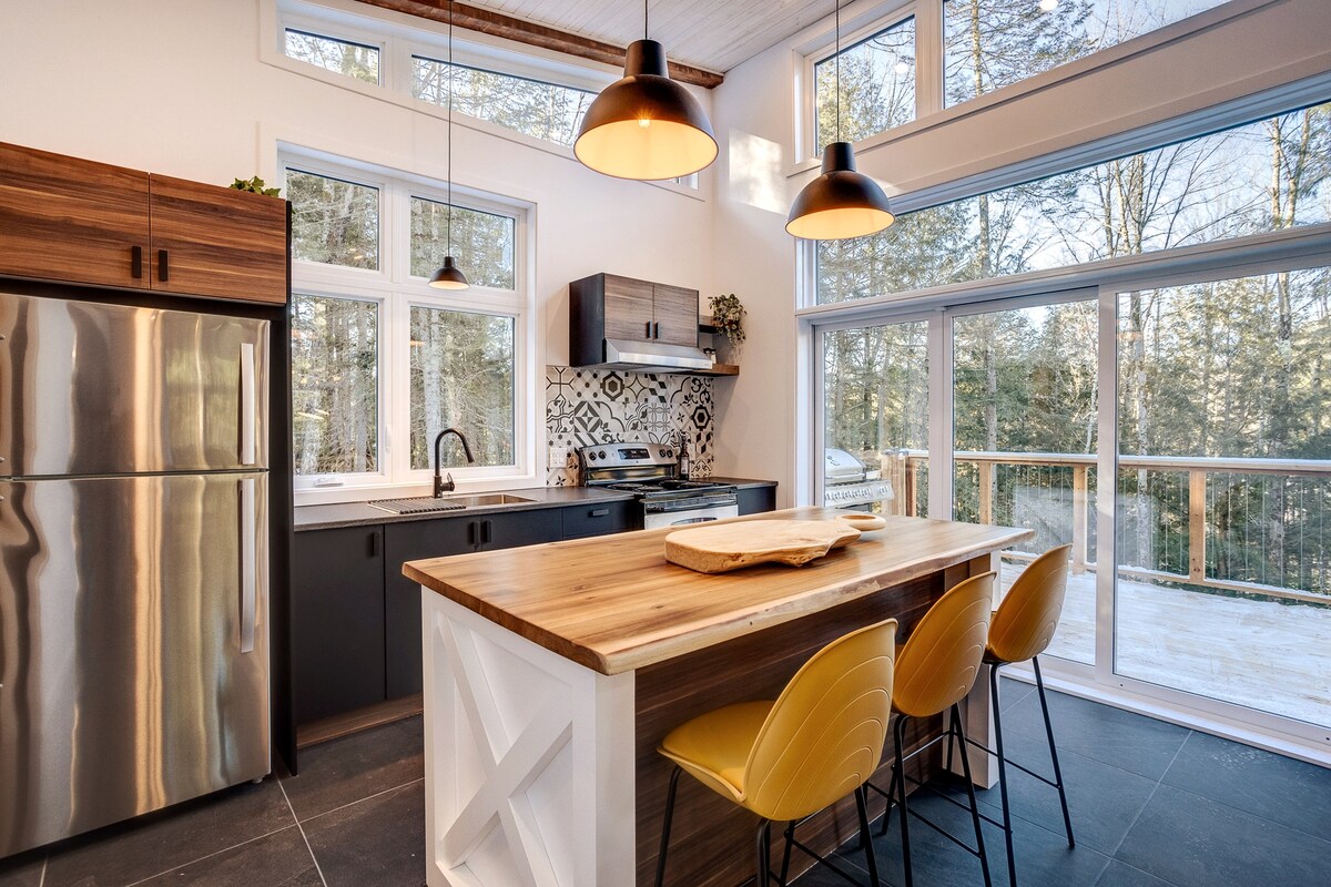 Svijetla planinska kuća u modernom skandinavskom stilu, savršena za opuštajući boravak s prijateljima i porodicom. Uživajte u privatnoj masažnoj kadi, sauni, unutrašnjem kaminu i vanjskom tušu koji se može koristiti tokom cijele godine, a sve to okruženo šumom. Oko 20 minuta od Owl's Heada i Jay Peaka, ovo je savršeno mjesto za skijanje, boravak na otvorenom i opuštanje.