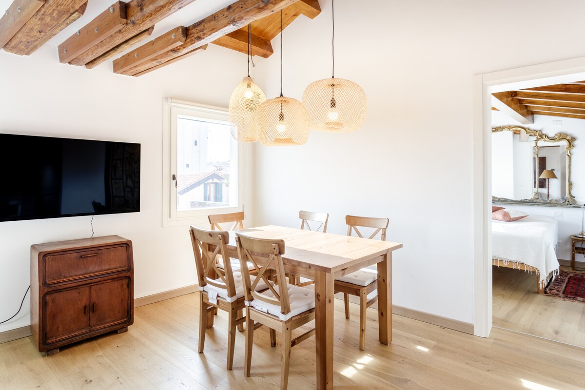 Affacciati dalle finestre e non ti sembrerà vero di vivere in una posizione tanto privilegiata tra i canali e le gondole. L'appartamento poi, con le sue linee pulite e le magnifiche travi del soffitto, saprà conquistarti. L’appartamento gode di una posizione unica, centralissima, ma allo stesso tempo molto silenziosa e tranquilla. Nelle immediate vicinanze si trovano supermarket, bar, ristoranti e tutte le principali attrazioni turistiche, come Piazza San Marco e Palazzo ducale.