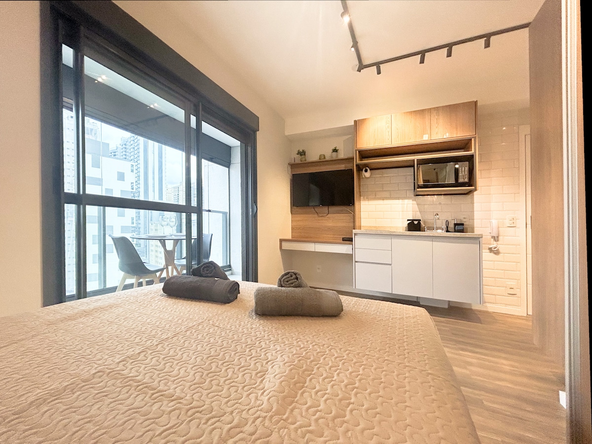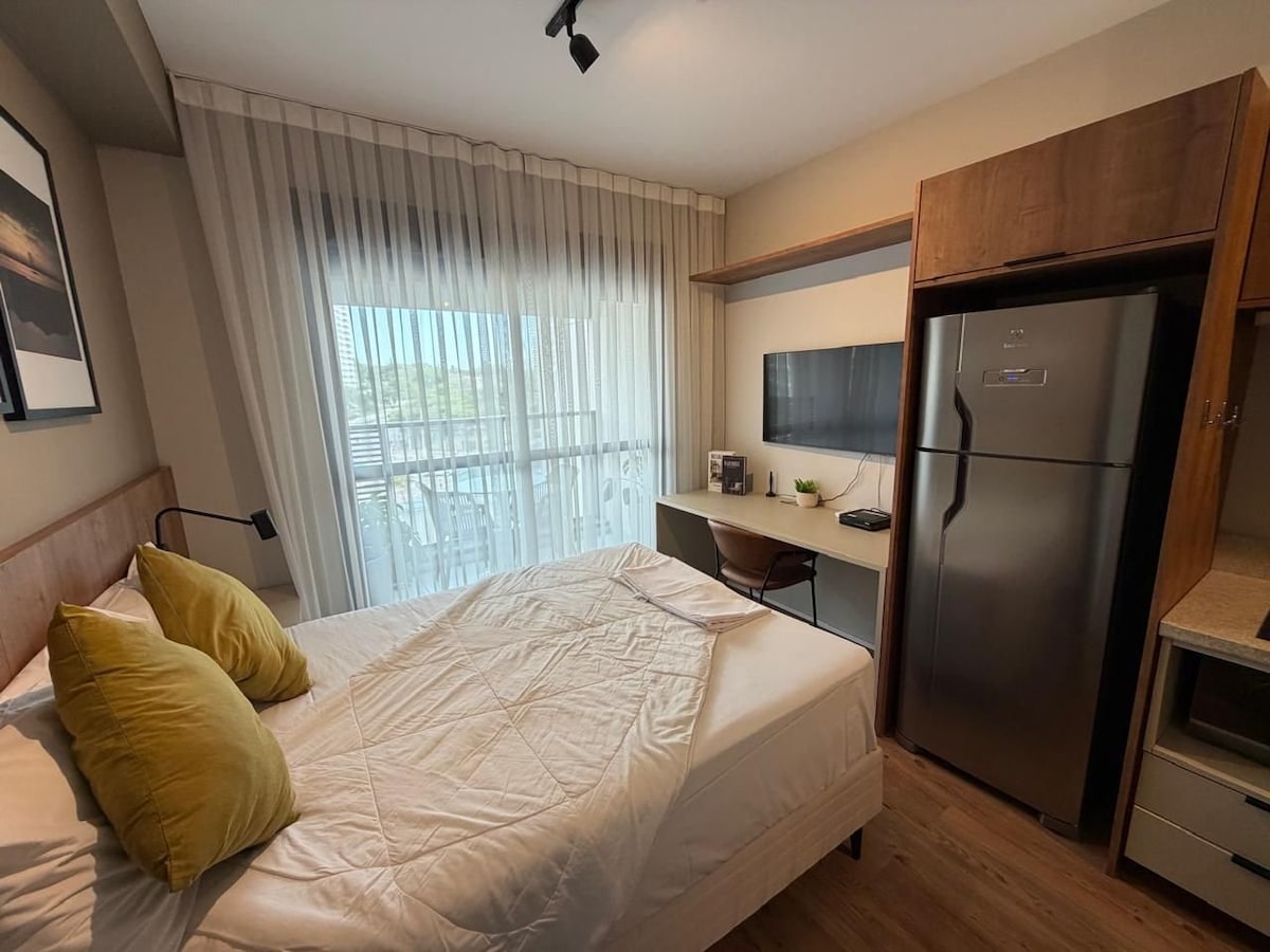 **Studio nema parking mjesto ** Boravite s udobnošću i privilegovanom lokacijom u São Paulu! Nekoliko minuta od strateških tačaka: - Estadio MorumBis e Vibra São Paulo – 6,4 km. - Interlagos Racetrack – 7,1 km. - Američki konzulat – oko 1,3 km pješice. Nastavni i istraživački centar Alberta Einsteina – 6 km. Aerodrom Congonhas - 4,5 km. - Stanica metroa - 40 koraka od stanice Brooklin - linija jorgovana Savršeno za poslovna putovanja i putovanja u slobodno vrijeme!