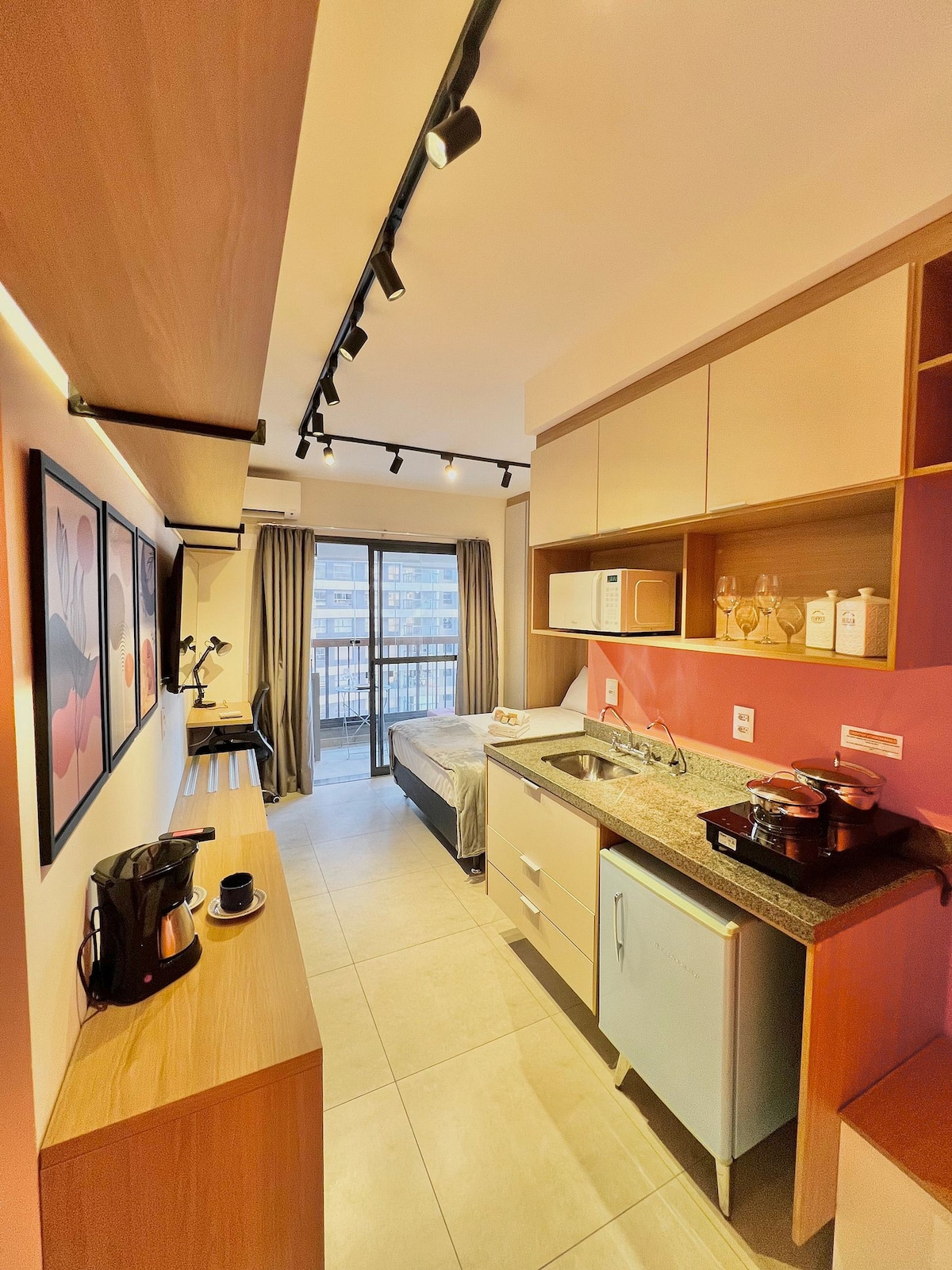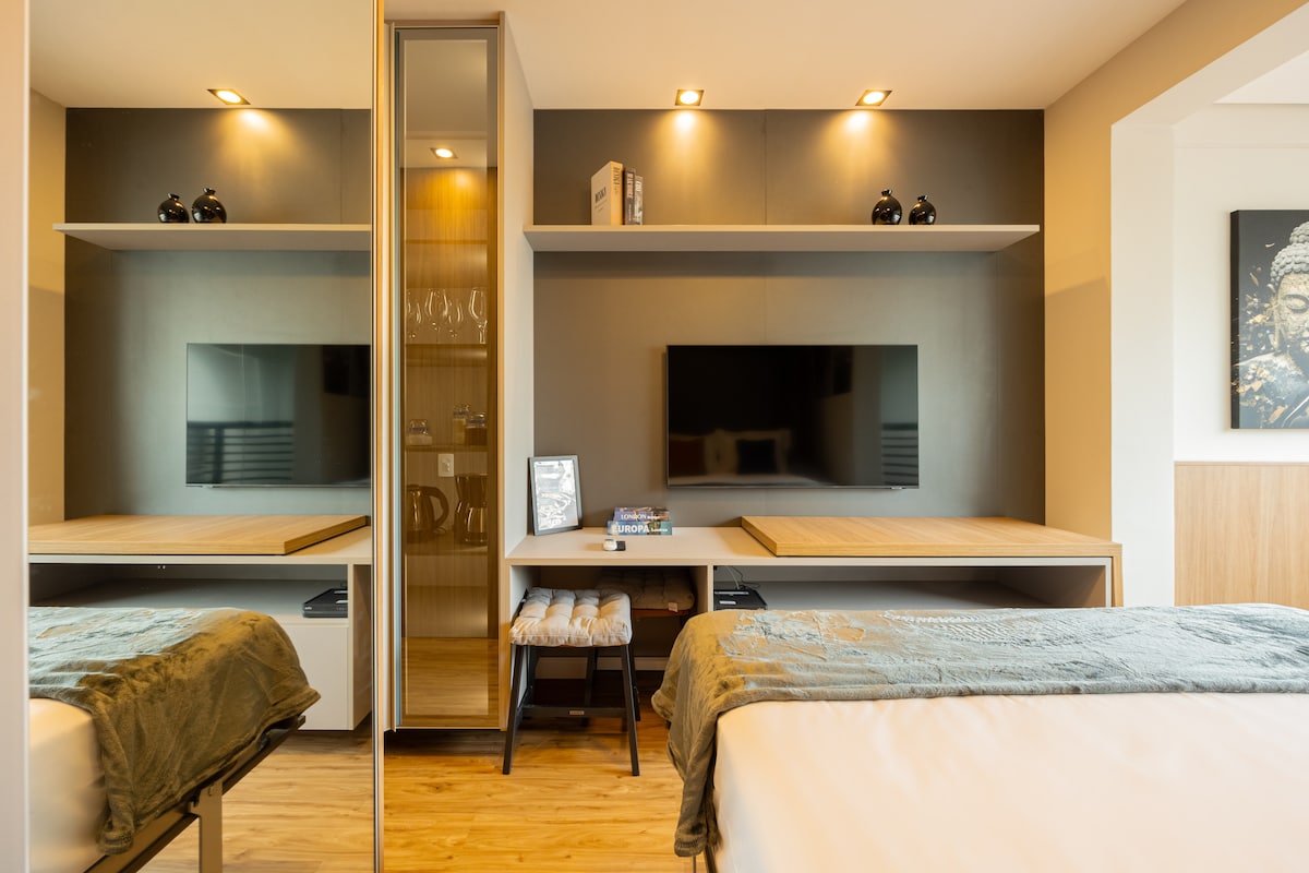 Osjećajte se kao kod kuće u ovom udobnom i modernom studiju na najboljoj lokaciji u Brooklinu, u veličanstvenom potpuno novom kondominiju 200 m od stanice podzemne željeznice Brooklin (linija Lilás – 5) i blizu Berrinija i Chácara Santo Antonija. - Dijelite prostor s prostorom za opuštanje, rad itd. - Zajedničko pranje veša Posebnosti: * Posteljina i boutique standardni peškiri * Potpuno opremljena kuhinja * Wi-Fi 300 mbps PAŽNJA: **Ograničeno** vrijeme korištenja teretane/bazena!