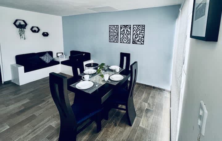 Dobro došli u ovaj jedinstveni stan u San Luis Potosíju savršen za urbani ili poslovni odmor, koji se nalazi u privilegovanom području u blizini bolnica i različitih fakulteta prestižne Autonomne SLP Uviversity, ispred parka neprocjenjive tradicije za porodice Patoos, uživajte u brzom Wi-Fi i TV-u s različitim platformama, spava u bračnom krevetu, klima-uređaju, terasi, teretani, natkrivenom parkingu, sigurnosti i udobnosti.