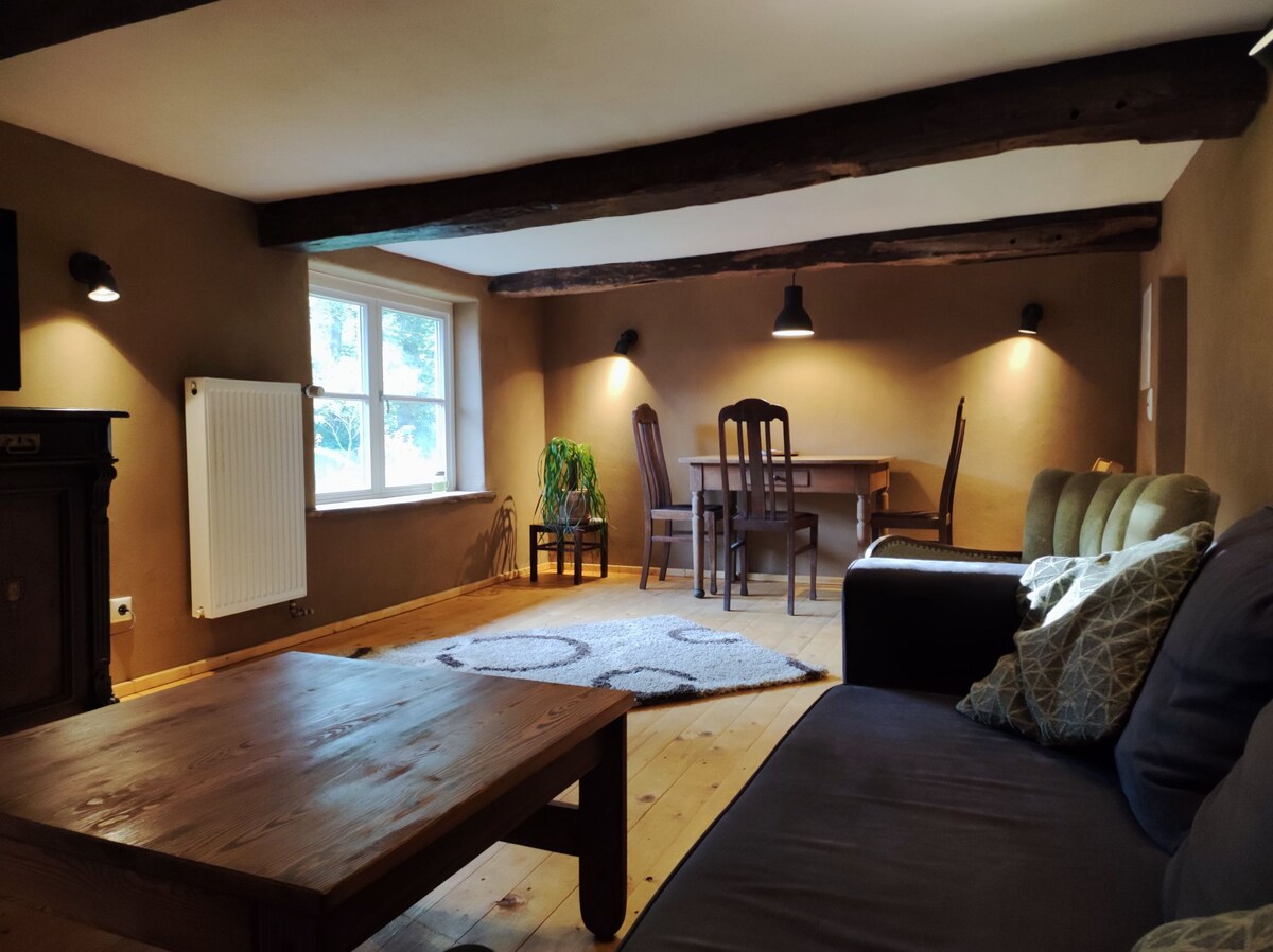 Potkrovlje ove kamene kuće , izgrađene 1865. godine, potpuno je novoizgrađeno . Ima predivno mirnu lokaciju s pogledom na polja i drveće ! Ovdje je zagarantovano da ćete se odmoriti! Na pješačkoj udaljenosti možete doći do terena za golf i jezera oko kojeg možete divno hodati ili trčati. Biciklističke ture se odavde mogu lako isplanirati odavde... Udaljen je oko 5 km od prekrasnog starog grada