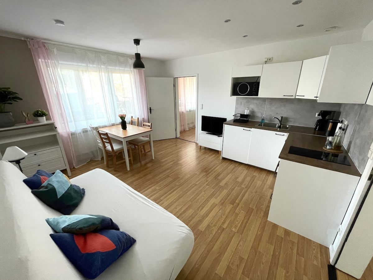 Moderan, svijetao stan s balkonom i pogledom na vrt – idealan za poslovne putnike. Brza veza (samo 2,8 km do A30), Wi-Fi, TV, radni prostor. Direktno preko puta: pekara, Aldi, Edeka, bar s grickalicama i frizerski salon. Potpuno opremljena kuhinja s mašinom za pranje suđa i aparatom za kafu. Kupatilo s mašinom za pranje veša. Bračni krevet i kauč na razvlačenje za najviše 3 osobe plus beba (krevetić je dostupan na zahtjev i 20 €).
