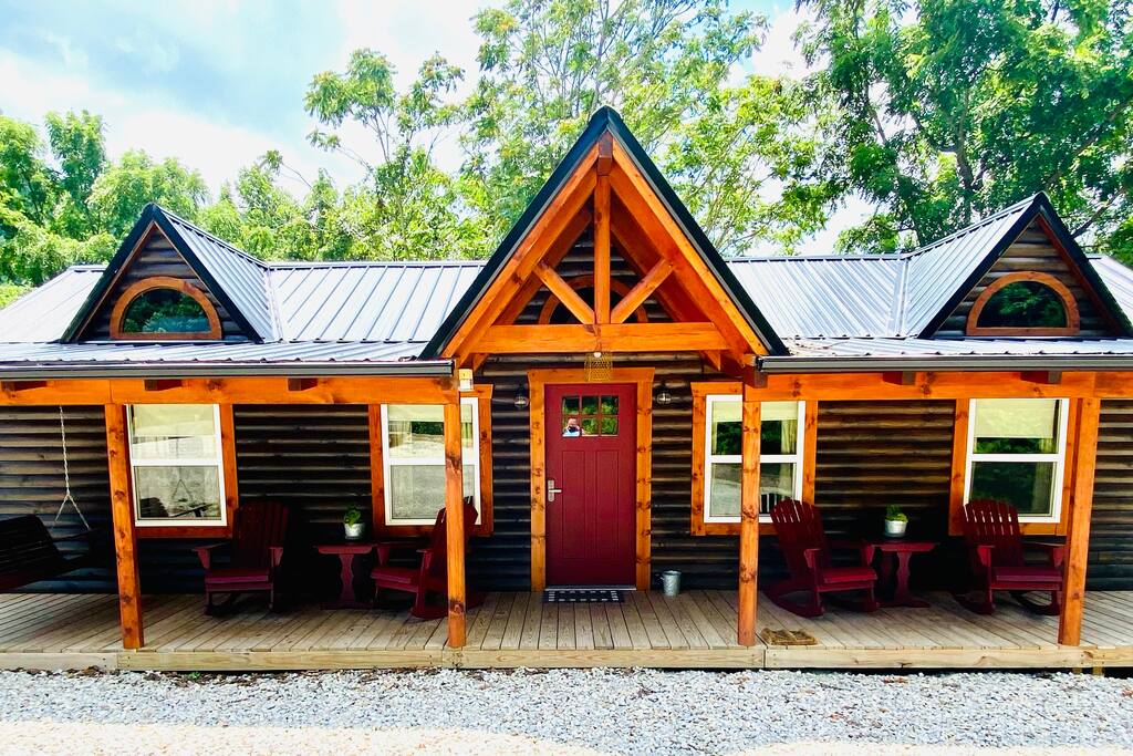 Privatni parking s pješačkim mostom od 10 metara s pogledom na vodeni tok koji će vas odvesti do seoske kućice. Spavaća soba s bračnim krevetom u prizemlju; spiralne stepenice vas vode do spavaće sobe s bračnim krevetom u potkrovlju; jedno kupatilo; kompletna kuhinja; TV/WI-FI; unutrašnja viseća ležaljka u potkrovlju; omotajte oko natkrivenog trijema; vanjski prostor za tuširanje prekriven drvećem s masažnom kadom; natkriveni stražnji trijem za ručavanje. Veliko ognjište sa suhim drvetom za potpalu. Velika vanjska viseća ležaljka veličine 12 stopa x 12 stopa pored ognjišta. Park Series roštilj na ugalj vani.