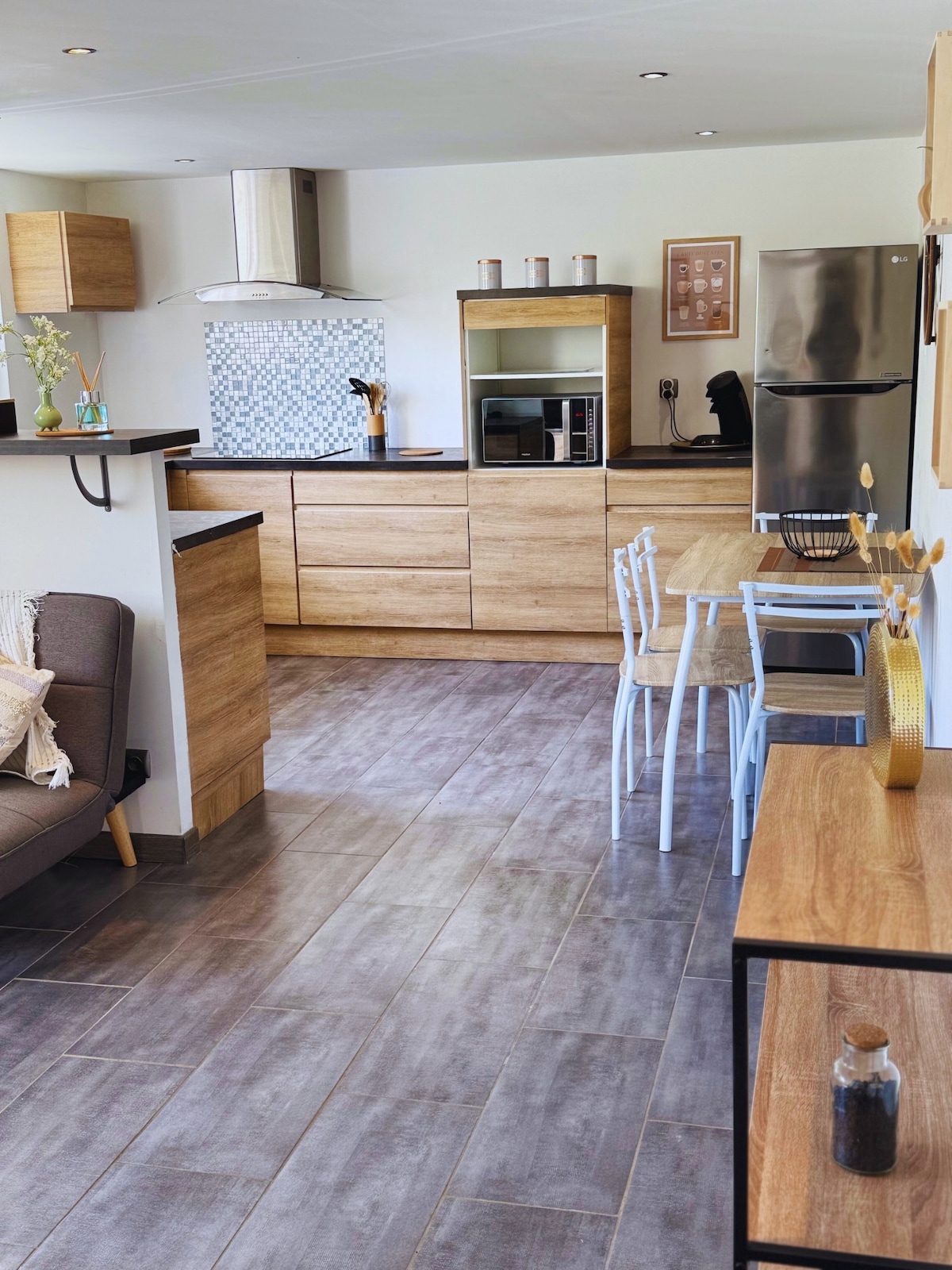 U blizini planina, ovaj stan od 100 m² udobno dočekuje cijelu porodicu: • 1 glavna spavaća soba (krevet 160x190) • 1 dječja spavaća soba (2 kreveta 90x190) • Veliko kupatilo s WC šoljom i mašinom za pranje veša • Svijetla dnevna soba i opremljena otvorena kuhinja • Kompletni sadržaji za bebe Odlična lokacija, samo 5 minuta do prodavnica (supermarket, pekara, restorani) i u blizini mnogih turističkih mjesta. Miran boravak, između moderne udobnosti i širokih otvorenih prostora!