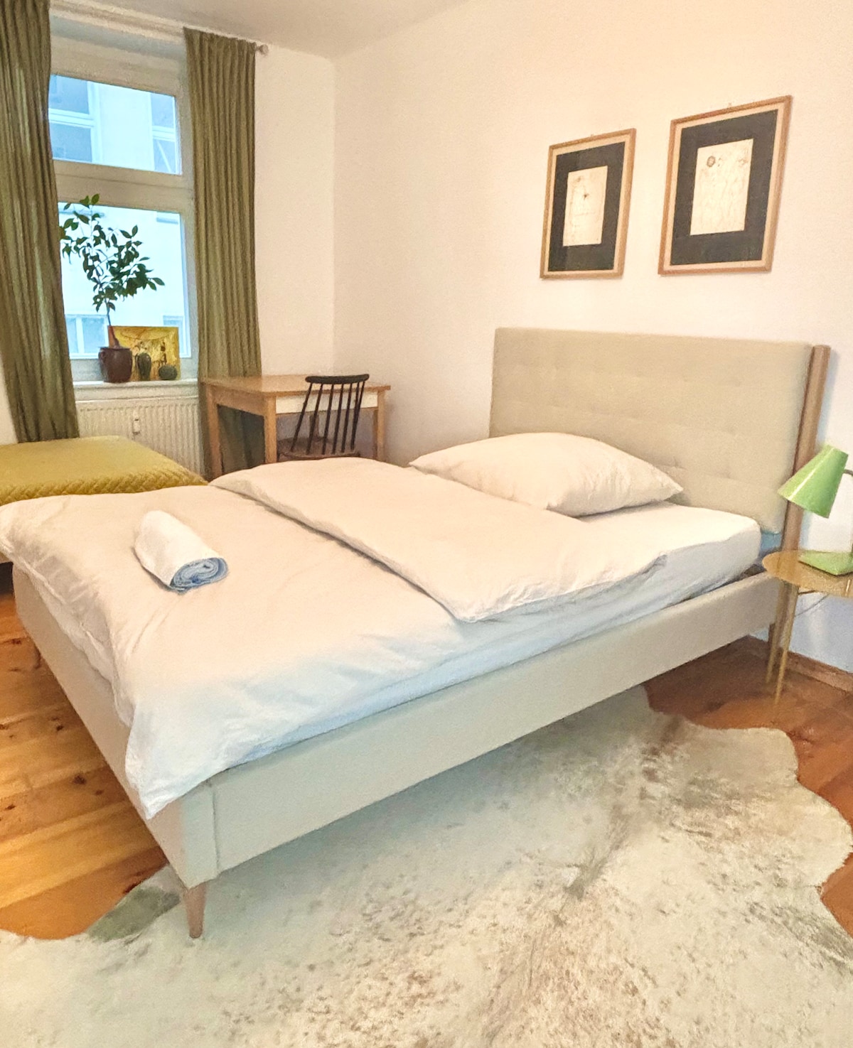This is a private room in my charming apartment in Prenzlauer Berg – one of Berlin’s most popular areas! Cafés, yoga studios, boutiques, and restaurants are all around. Major sights like Alexanderplatz, Museum Island, and Berlin Cathedral are just 10–20 minutes away by tram or subway. Your room is spacious with a queen-size bed and a small extra bed.