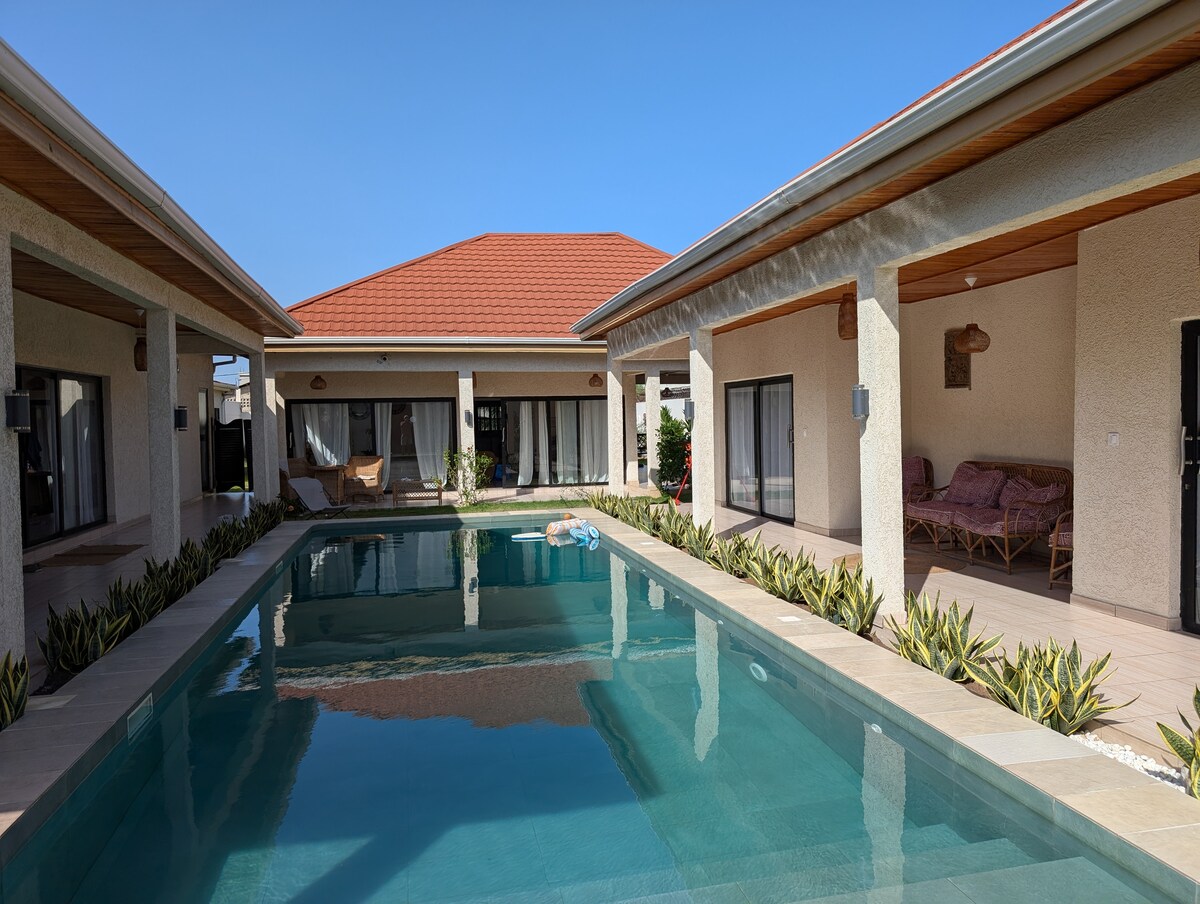 Ovaj smještaj se nalazi u centru, samo nekoliko minuta od aerodroma. Prikladno je za porodice s bazenom, vanjskim salonom i elegantnim dekorom. Sa 24-satnom strujom i besplatnim Wi-Fi mrežom, idealan je za digitalne nomade koji žele raditi na daljinu, kao i za porodice koje žele uzeti taj zasluženi odmor u mirnom i modernom domu.
