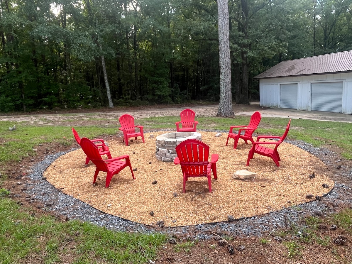 Dobro došli u našu prekrasnu kuću na drvetu s drvenim okvirom! Ručno izgrađeno od strane lokalnog stolare Davida Greena, ovo umjetničko djelo gleda na rijeku Ocmulgee. Naš dvospratni smještaj ima dvije verande, spavaću sobu u potkrovlju (bračni krevet), dnevni boravak (sjedalo pored prozora/bar/single krevet) i kuhinju (sudoper od lijevanog željeza koji se aktivira nogom, vanjska peć za kampovanje, prostor za pripremu hrane, posuđe, pribor za kuhanje i još mnogo toga). Trenutno (ljeto 2025.) ne postoji unutrašnji toalet. Imamo dostupan toalet u stilu kampa (Luggable Loo).