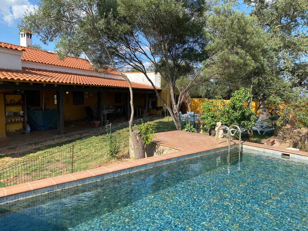 Reg. turizam: TR-BA-00110 Kuća s 4 spavaće sobe s kaminom, roštiljem, đakuzijem, dva bazena, nogometnim terenom, košarkom, stolnim tenisom, voćnjakom, ekološkim pilićima i jama za konje. Stropni ventilatori u cijeloj kući. Električna stanica za punjenje na imanju. Besplatno. Prihvatamo kućne ljubimce. Mnogo mira i tišine. Sjajan pogled. S verande možete vidjeti mnoga sela u regiji, borovu šumu, kestenove, masline, smokve i hrastove. 45 km od Sevilje ili Méride