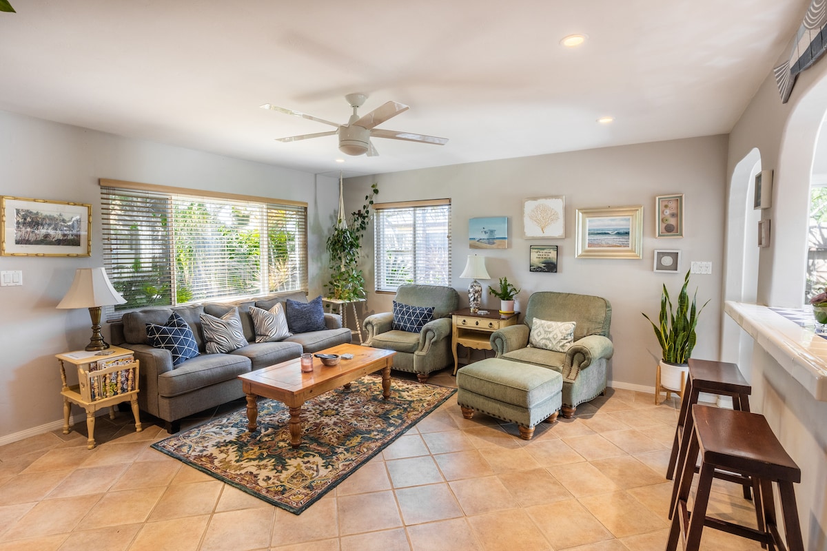 Privatni prostor s 1 spavaćom sobom i 1 kupatilom u srcu Encinitasa! Prošetajte do plaža Swami (0,5 milja) i Moonlight (0,7 milja), parkova, joge i još mnogo toga. Uživajte u udobnim krevetima, opremljenoj kuhinji/kupatilu, privatnoj praonici rublja, Wi-Fi mreži i Netflixu. Uključuje 1 parking mjesto (dostupno je i parkiranje na ulici, ali nemojte parkirati ispred susjeda). 🐾 Kućni ljubimci su dobrodošli (75 USD po kućnom ljubimcu, maksimalno 2, navedite prilikom rezervacije). 🔇 Tihi sati 22:00–8:00. Idealno za odmor na plaži ili rad na daljinu uz sve udobnosti doma.