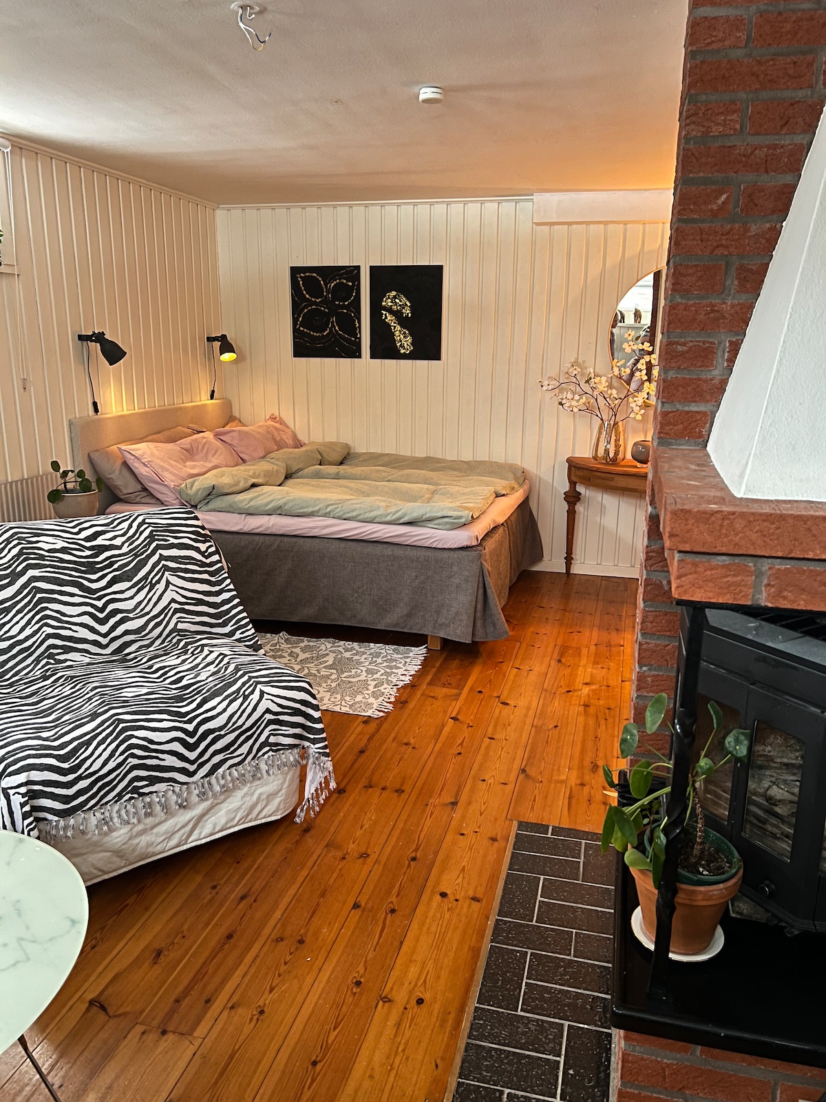 Drvena kuća s terasom i roštiljem na velikom zajedničkom zemljištu u mirnom seoskom okruženju. Blizina prirode i kupanja. Kuća ima dnevni boravak s kaminom (besplatno drvo), Wi-Fi i TV, kao i krevet (140 cm) i kauč na razvlačenje (130 cm). Odvojena kuhinja sa štednjakom, mikrovalnom pećnicom i aparatom za kafu. Kupatilo s tušem i kemijskim WC-om. Pristup sauni sa sobom za opuštanje po dogovoru i naknada od 100 kruna. Posteljina i peškiri se mogu iznajmiti za 150 kruna po osobi. Završno čišćenje nije uključeno, može se rezervisati za 500 SEK. 5 minuta vožnje do trgovačkog centra.