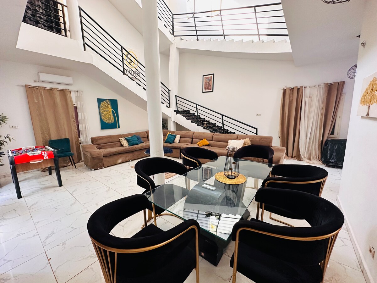 Villa “So Queen” à Kabala Découvrez cette belle villa avec 6 chambres, un grand salon moderne, une cuisine équipée et un superbe balcon. Profitez d’une piscine privée entourée de verdure pour un séjour reposant en famille ou entre amis. Située dans un quartier calme, la villa allie confort, élégance et intimité. Passez un séjour agréable sans coupure d'électricité !