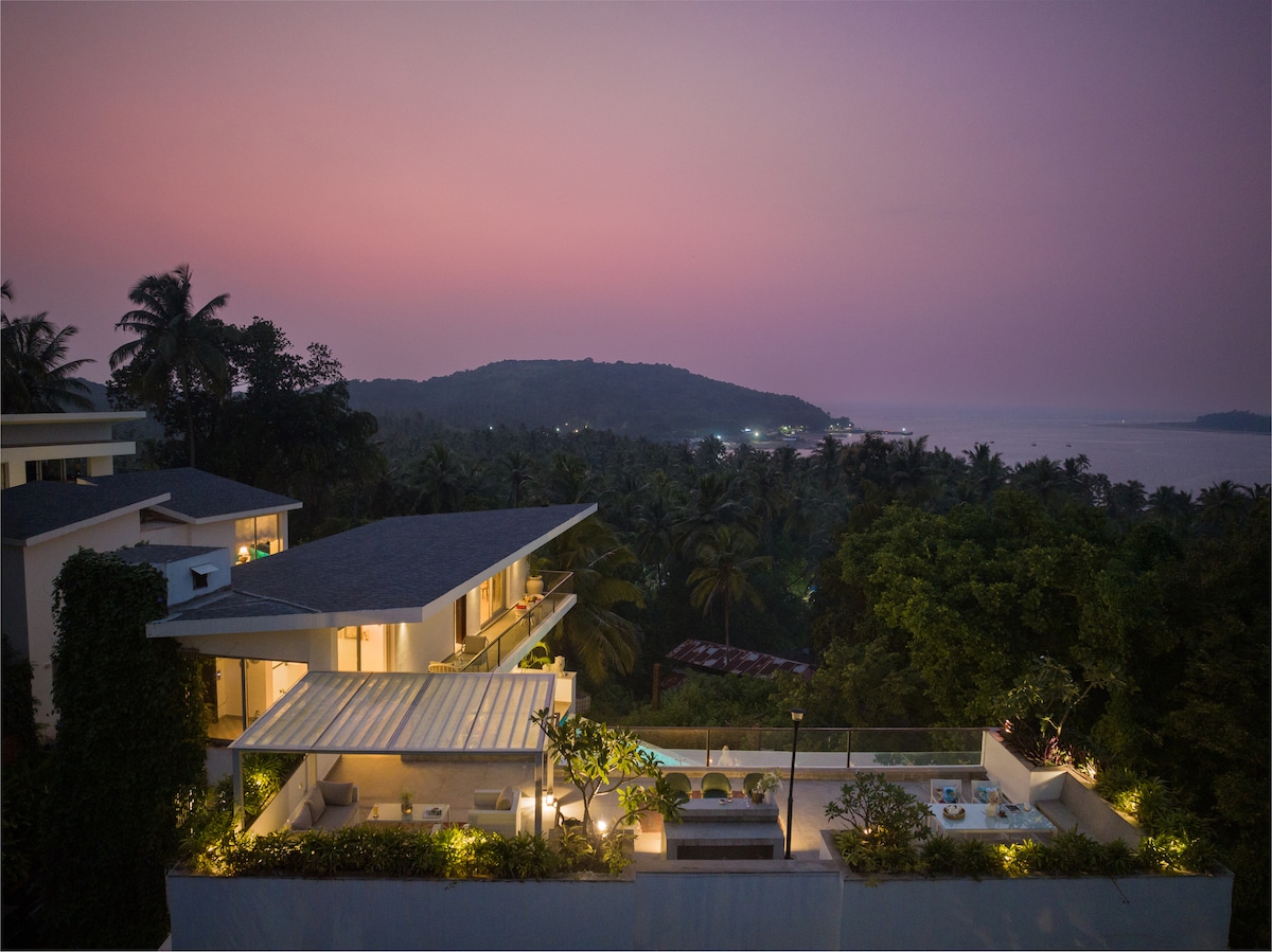 Serene Bayview In a class all by itself Presenting you this new Haven tpp-notch interiors with An Ocean view. Beautiful views from the open terrace & the living room giving you a magical holiday experience with this 5 bedrooms 6 washrooms, 4 ensuite rooms, patio by the pool, an open terrace, 2 garden area. Located in the heart of VAGATOR, from here beach is only 2 mins drive. Location: Vagator 5 mins drive to the beach. Our very new addition Serene Bayview by Serene Escapes Luxury Villas