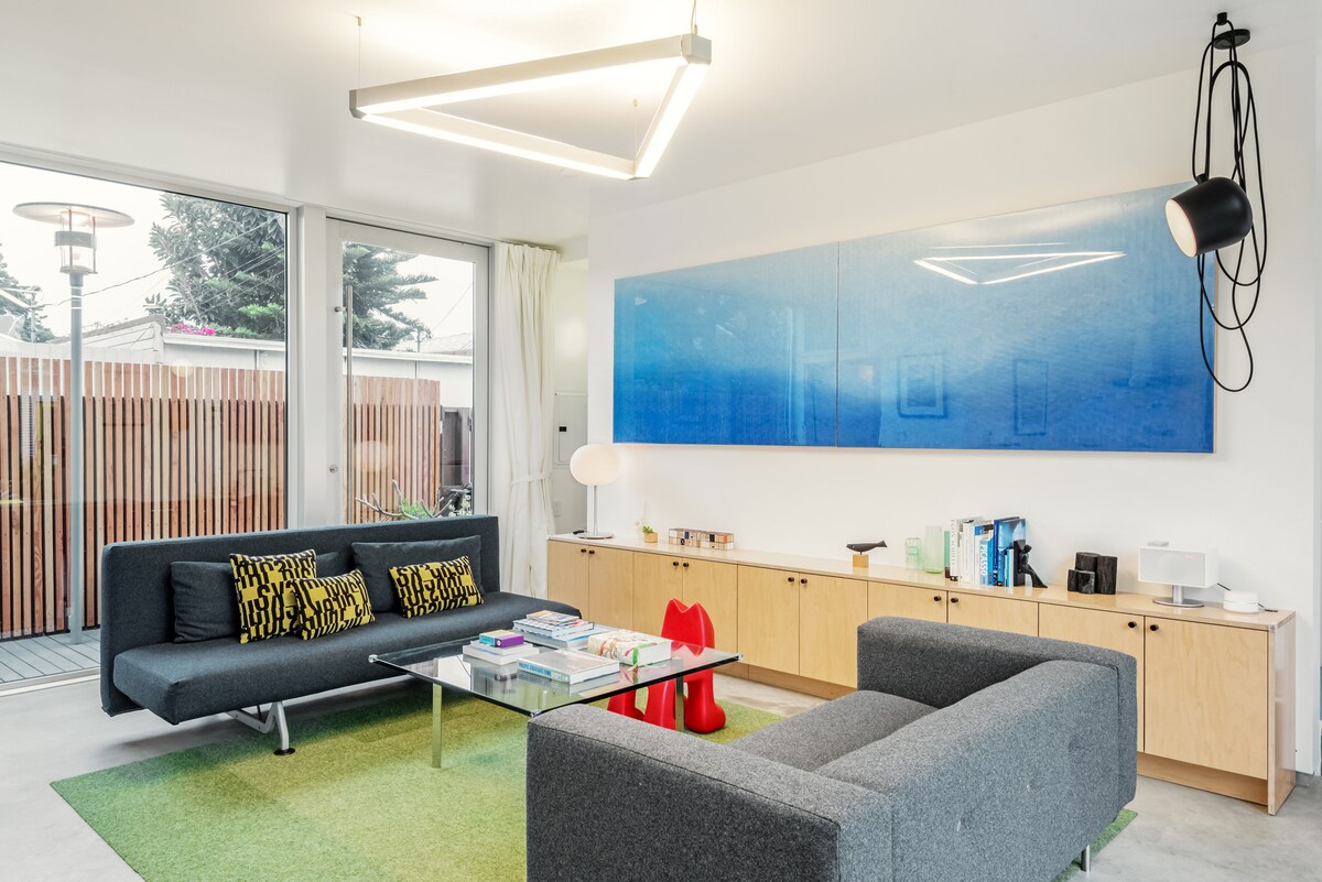 Hvala vam na Arhitektonskom pregledu što ste nam dali naziv 1 od 7 najboljih Airbnb smještaja u Los Angelesu! Djeci će se svidjeti kreveti na sprat i vanjsko igralište. Odrasli će uživati u svjetlu i okeanskom povjetarcu koji se ulijeva kroz prozore od poda do plafona i kuhinju prikladnu za porodice. Dizajnerski namještaj i moderna umjetnička djela obiluju u ovom novoizgrađenom prostoru.