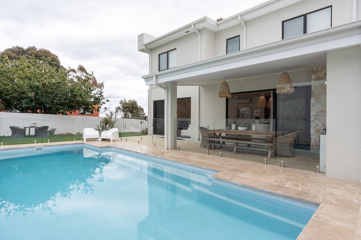 Dobro došli u svoj dom za odmor iz snova. Doživite čaroliju planine Martha na spektakularan način uz ovu luksuznu rezidenciju uz plažu koja pruža pogled na zaljev Port Phillip Bay. Ova upečatljiva kuća za odmor ima panoramski pogled na zalaske sunca tokom cijele godine iznad vode i brodove koji prolaze na horizontu ograđen u zabačenom i privatnom okruženju. U večernjim satima možete promijeniti boju našeg bazena od 14,4 m *4 m pomoću daljinskog upravljača.