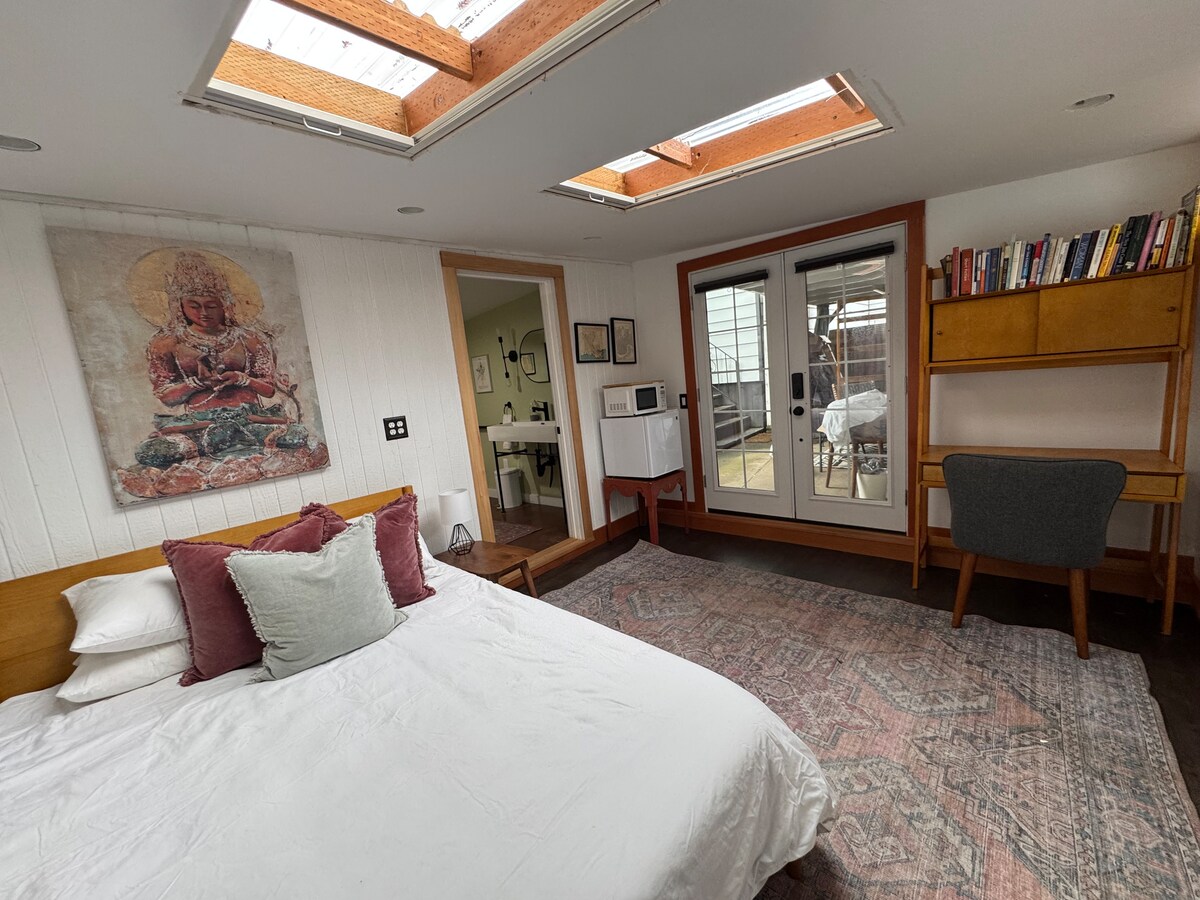 Opustite se u ovom privatnom, svijetlom i udobnom studiju s potpuno ograđenim dvorištem. Ušuškajte se pored vanjske vatre ili uživajte u zalasku sunca ispod natkrivene terase. Opremljeno TV-om, Wi-Fi mrežom i FireStickom kako biste se mogli jednostavno povezati sa svojim omiljenim emisijama. Kuhinja ima mikrovalnu pećnicu, mini-frižider, indukcijsku peć, mašinu za pranje sudova i sve potrepštine koje biste očekivali! Uživajte u udobnoj posteljini iz Brooklina (najbolja je!). Kompletno kupatilo s perilicom/sušilicom, tuš kabinom i izuzetno mekim peškirima za kupanje!