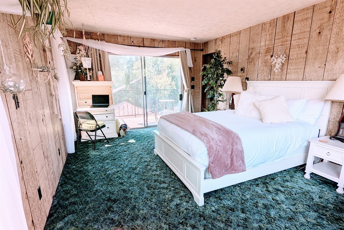 Smješteno među 200 stabala, uključujući hrast, bor i cedar. Unutra je otvoren raspored sa 3 spavaće sobe s francuskim krevetima na spratu, peći na drva i dječjim apartmanom u prizemlju s krevetima na sprat, igrama i TV-om. Vani se nalazi viseća ležaljka, stolica za meditaciju, ljuljačka, kućica na drvetu i trampolin. Savršeno mirno okruženje za duhovne tragače s mnogo prostora za meditaciju na imanju. S terase iza kuće i uz brdo se pruža pogled na planinu Shasta. Brdo je također odlično za sanjkanje zimi.