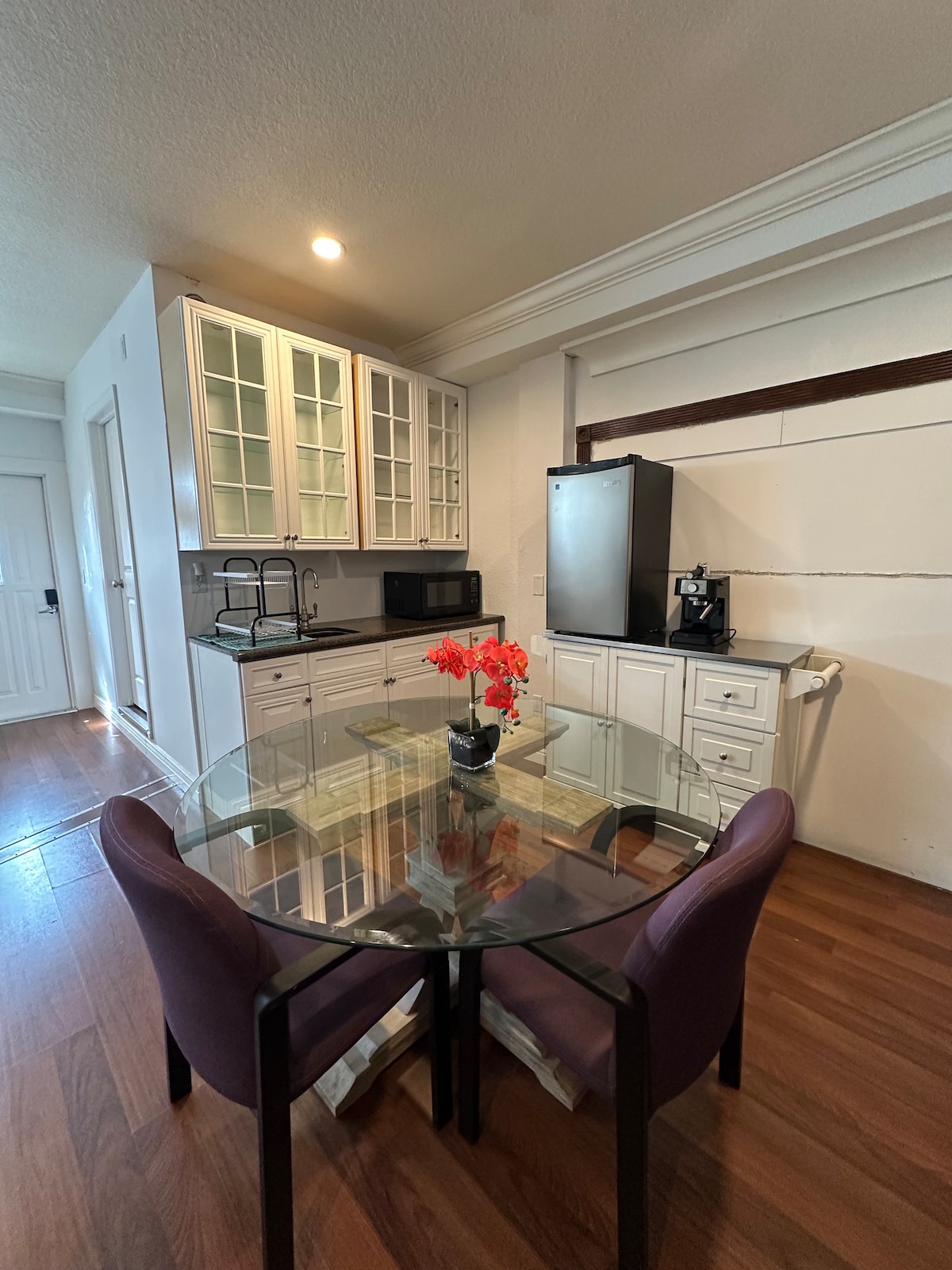 Small suite w/own entrance & private walkway & own private small BA has walk in shower, smallish toilet area will accommodate most adults - but too small for ex tall - more than 6'5" or obese individuals. All and all, very cozy one room studio with micro kitchenette mini fridge, microwave, beach towels & sand chairs & small shoulder cooler. Our location 4-6 Miles CONVENIENT to BEACHES, AIRPORT & DOWNTOWN WEST PALM, CITY PLACE & CLEMATIS - Uber rate friendly 6 miles from PBI AIRPORT,