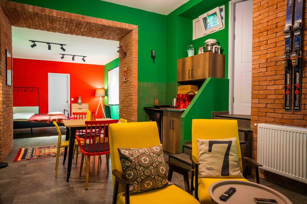 INDUSTRIAL Studio in old soviet building designed by "VIRSTAK", brings unique atmosphere with spectacular day and night CITY VIEW enjoyable from the BATHTUB. -100% HANDMADE. - Not a RANDOM cozy/ functional apartment, Studios amenities consists of old vintage and industrial furniture, for some people might feel uncomfortable out coming from a personal taste. Artistic vibe making you feel like in movies. - WINERY - 9 SORTS of wine - Movie Projector Airport pickup Suzuki Swift 80 Gel
