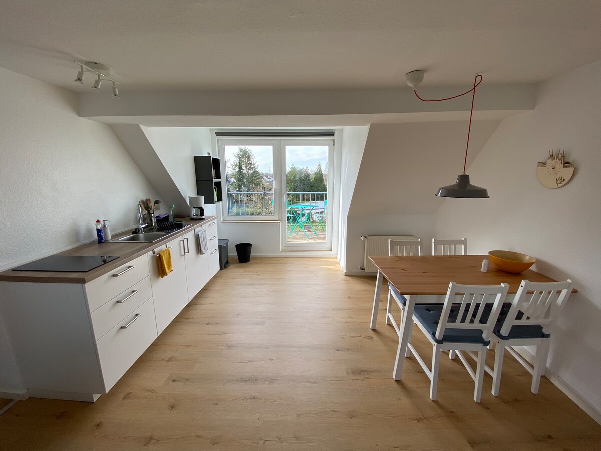Dobro došli u naš ukusno namješten stan. Uživajte na 2 sprata stambenog prostora tokom boravka u Kelnu: - dobro opremljena čajna kuhinja sa mašinom za suđe, - udobna trpezarija - mali, ali lijep prostor za opuštanje s ravnim ekranom, - kupatilo od prirodnog kamena i tuš kabinom u prašumi - elegantna spavaća soba (pravo drvo) s udobnim krevetom, također s TV-om - sa lijepim vremenom: jutarnje sunce na maloj terasi
