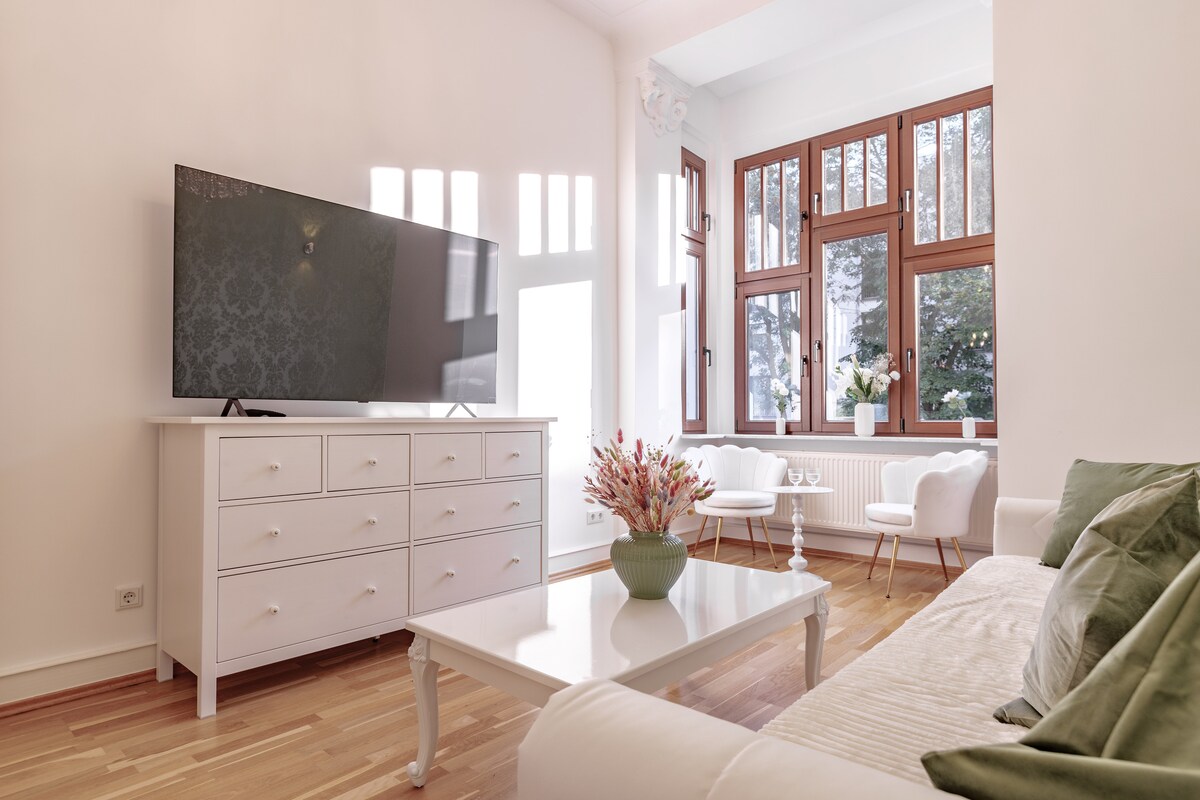 Ovaj stan se nalazi u historijskoj kući i možete ga koristiti za sebe. Mi /vlasnici živimo na gornjim spratovima. Stan je potpuno opremljen i ima veliki dnevni boravak, tihu spavaću sobu, odvojenu i dobro opremljenu kuhinju i kupatilo (drugi WC u hodniku). U spavaćoj sobi dvije osobe mogu spavati u krevetu širine 1,80 m. Treća opcija za spavanje daje kauč na razvlačenje od 2 m (kauč za spavanje) u dnevnoj sobi. Teoretski dvije osobe mogu spavati tamo. Peškiri i posteljina su zasigurno uključeni. Stan ima led TV i WLAN. Korištenje vrta je stvar aranžmana. Udaljenost samo 2-3 minute do zaustavljanja gradskog tramvaja broj 4. S ovom linijom stižete sajam/izložbeni centar bez promjena za 15 minuta, za 25 minuta stižete do centra grada i bez promjena. Veliki supermarket i druge prodavnice udaljene su 100 m. Restoran i bistro do kojeg možete doći pješice. Pušenje u stanu nije dozvoljeno, ali naravno da možete pušiti u vrtu. Ako putujete automobilom, naći ćete parking mjesta ispred kuće ili u blizini. Šuma, jezero i park za jelene na udaljenosti od 3 km nude vam priliku za rekreaciju i trčanje.