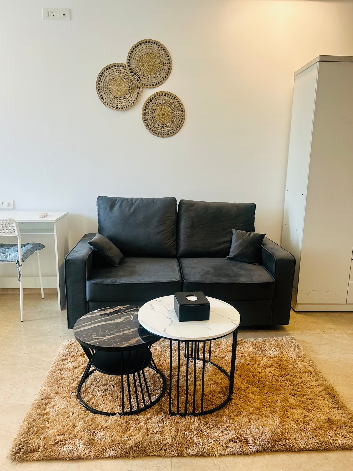 Boravite u luksuzu u našem potpuno namještenom 1BHK apartmanu, koji nudi udobnu spavaću sobu, dva kupatila (jedno u sklopu spavaće sobe, jedno zajedničko) i potpuno funkcionalnu kuhinju s aparatima i osnovnim priborom za kuhanje. Opustite se u prostranom dnevnom boravku s velikim pametnim TV-om i elegantnim dizajnom enterijera. Uživajte u luksuznom namještaju koji stvara dom daleko od doma. Savršen i za kraće i za duže boravke, ovaj stan obećava udobnost i praktičnost na vrhunskoj gradskoj lokaciji. Rezervišite sada za izvanredan boravak!