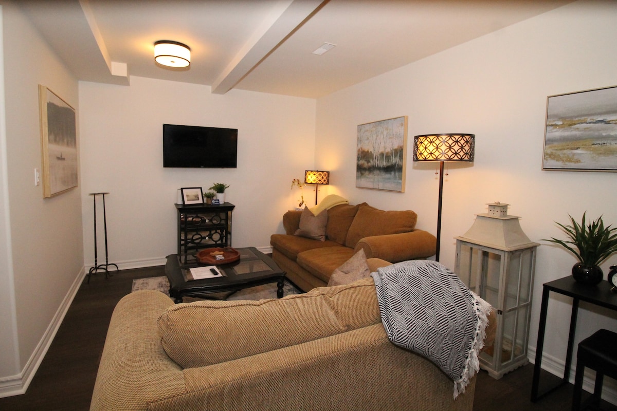 Dobro došli u planinsku kuću na rijeci Muskoka! ** Prije rezervacije pročitajte cijeli opis smještaja.** Opustite se u svom potpuno privatnom jednosobnom stanu s privatnom kuhinjom, udobnom dnevnom sobom, pametnim televizorima i tostiranim kaminima. Istražite naše zajedničke vanjske prostore duž 60' obale. Uživajte u masažnoj kadi za opuštanje. Samo nekoliko minuta hoda do grada za kupovinu, objedovanje i noćni život. Rezervišite sada za savršenu mješavinu udobnosti i praktičnosti!