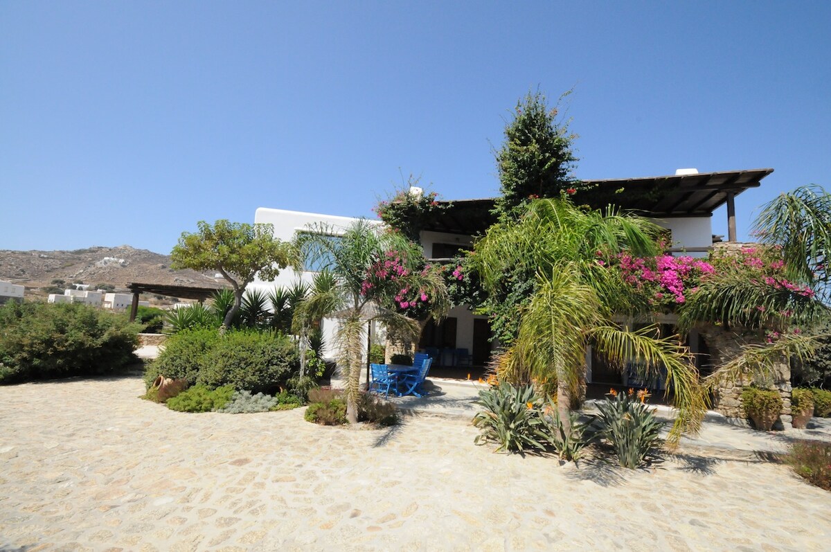 Divers House Calypso apartment. A relaxed atmosphere philosophy. Located in the South side of the island at a very nice secluded area, perfect for relaxation and overlooking Elia beach, just five minutes from the local airport and ten minutes from Mykonos town. Closest beach Super Paradise and Agrari is only five minutes away by car.