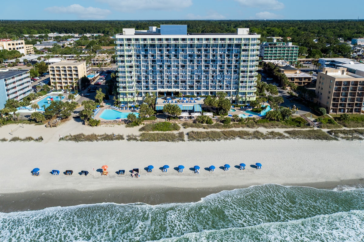 This Beautiful 1BR, 1BA Oceanfront Suite, sleeps 5 and is very spacious. 1st floor with private balcony and stunning Oceanfront view. 1Br with King bed, living room has a pull down murphy and sofa sleeper. Granite counters in both kitchen & bath with a large shower and full efficiency kitchen. 2 TV's, wifi, Iron, blow dryer, 2 pools indoor/outdoor, 2 Jacuzzi's indoor/outdoor, lazy river, lawn chairs/umbrellas and a quick walk to the beach. Ask about our honeymoon/anniversary packages we offer.
