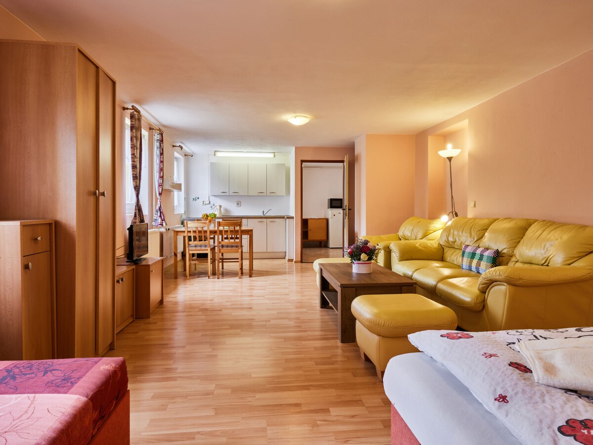 Svi popusti su već uključeni, slobodno rezervišite smještaj ako su datumi putovanja dostupni. U nastavku pogledajte sve detalje oglasa „U Šustrů”, 1-sobni studio površine 30 m2, u prizemlju. Prostran i svijetao, udoban namještaj: dnevni boravak/spavaća soba s 1 kaučem na razvlačenje (120 cm), 2 bračna kreveta i TV sa satelitskim programima. Čajna kuhinja (rerna, 4 keramičke staklene ploče za kuhanje, kuhalo za vodu, mikrovalna pećnica, zamrzivač) sa trpezarijskim stolom. Tuš/WC. Solarna energija. Unutrašnje dvorište.