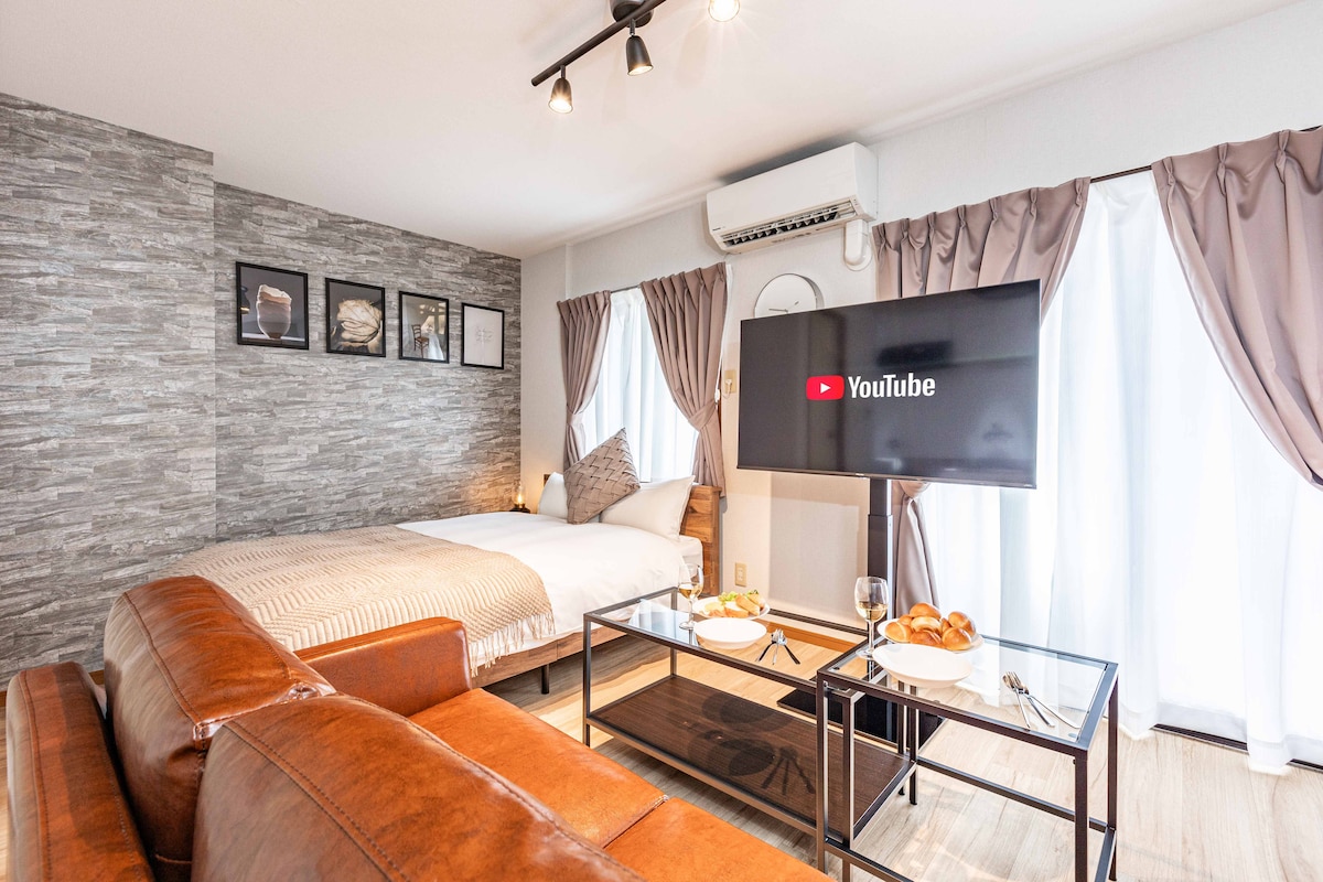 駅近で生活に便利、清潔な1LDK30㎡、快適クイーンベッド。なんば駅2駅5分、空港直通