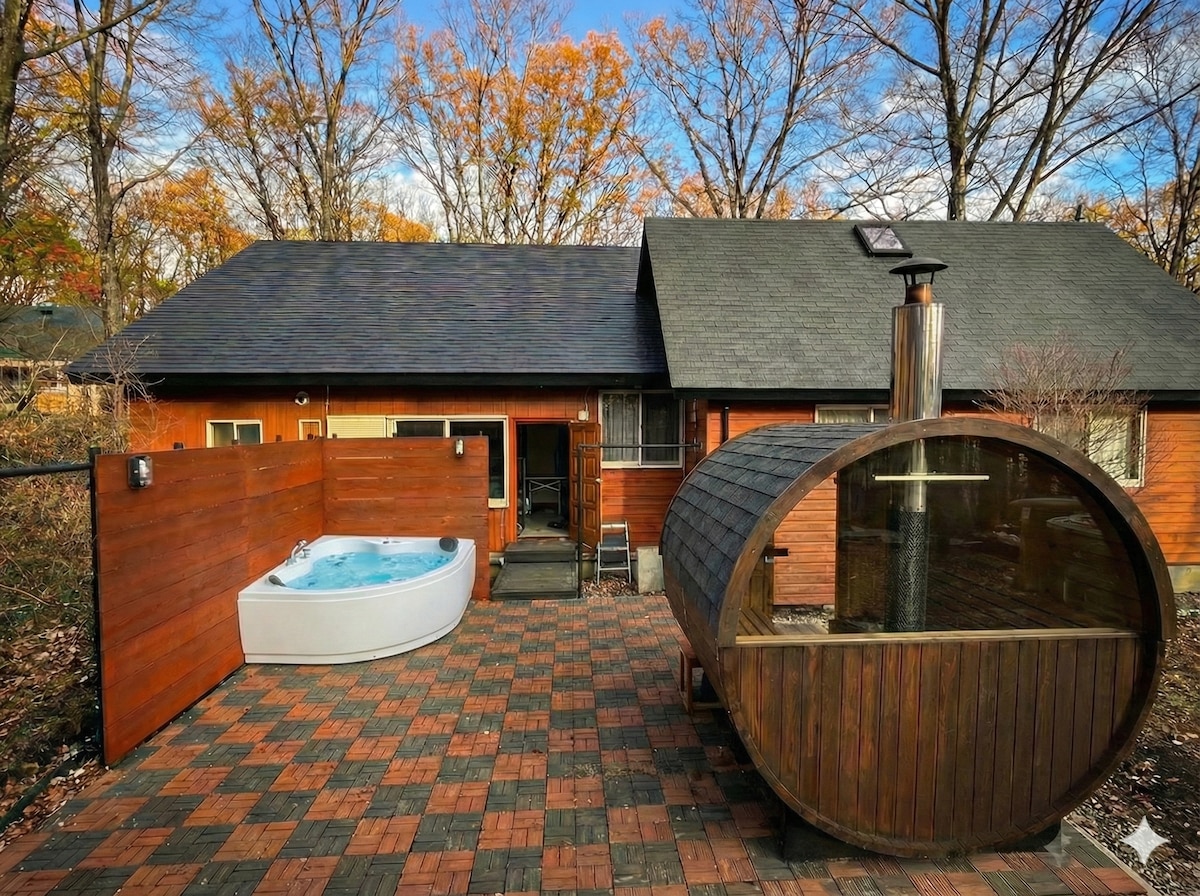 バレルサウナ・ジャグジー&薪ストーブ完備|無料駐車場4台|ログハウス&モダンヴィラ|那須ハイ車5分