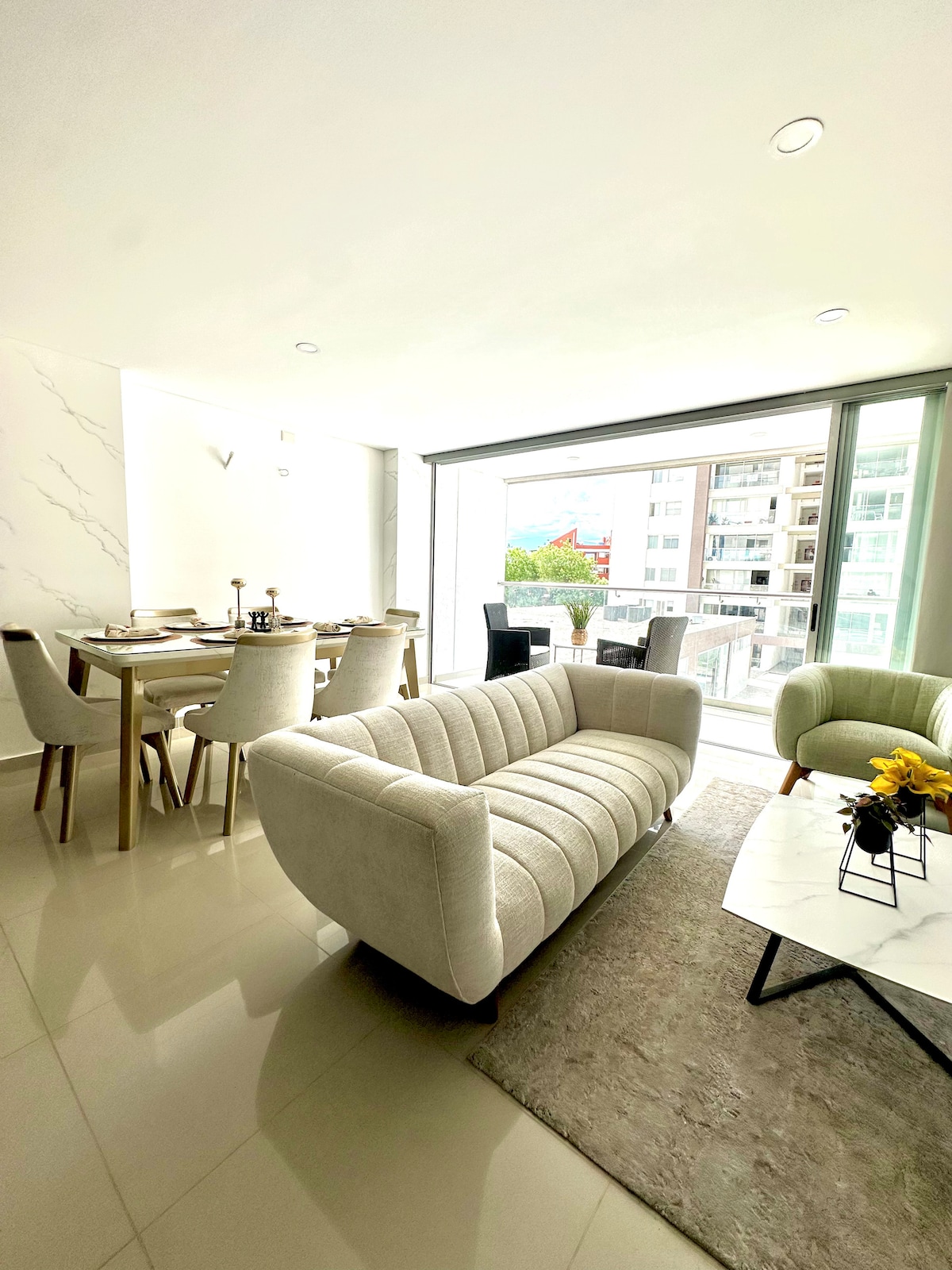 Lujoso y elegante apartamento en Neiva, diseñado para ofrecer comodidad y estilo. 1 habitación principal con cama king y baño privado, dos habitaciones auxiliares con camas dobles, baño auxiliar, y una amplia sala-comedor, balcón y una espectacular vista al aeropuerto. Cocina tipo americana, estudio, Wi-Fi, aires acondicionados, dos parqueaderos privados, decoración minimalista, amenidades como terraza con vista 360° a la ciudad, zona BBQ, piscina infinita, jacuzzi, gimnasio, sauna, turco.