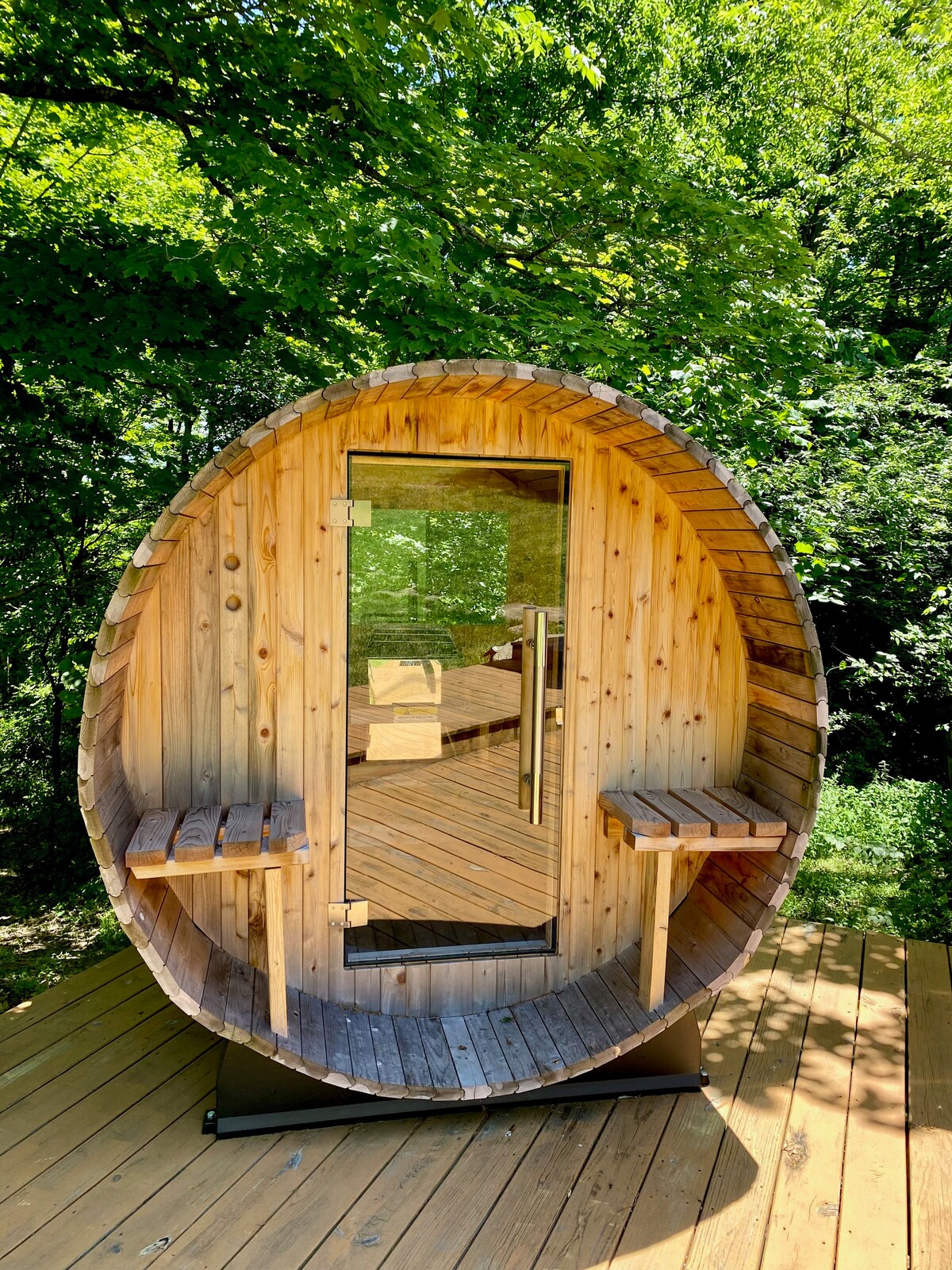 This is what you call glamping! Get away from it all when you stay under the stars at the Shot Glass Tiny House on wheels located at the end of a backroad surrounded by nature with a small stream out front approximately 3 miles from Maker’s Mark. You will be able to observe wildlife through the big picture window out front and surrounding windows throughout while staying comfortable as you glamp in the rustic style tiny house on wheels.