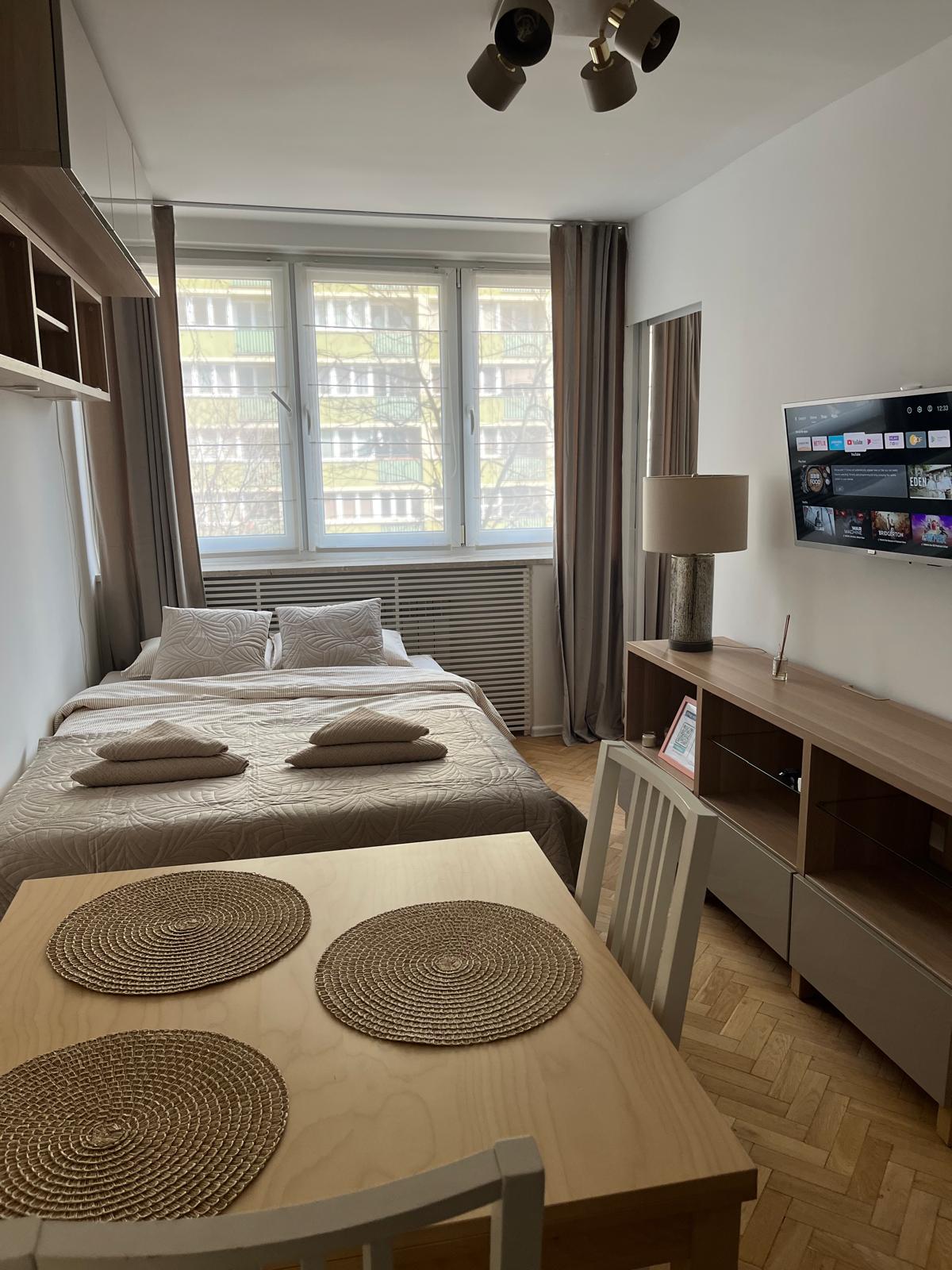 Stan Visa i Palača kulture. Odlična lokacija za istraživanje Varšave, pješke do najzanimljivijih atrakcija Varšave. Ima mnogo barova i restorana, kao i prodavnica i butika. Odlična komunikacija 3 minute do stanice podzemne željeznice, autobuska stanica, 5 do centralne stanice, 20 minuta od aerodroma Prostrani dnevni boravak s čajnom kuhinjom, velikim i udobnim kaučem, TV-om i klima-uređajem. Spavaća soba s bračnim krevetom (140). Kupatilo s tušem.